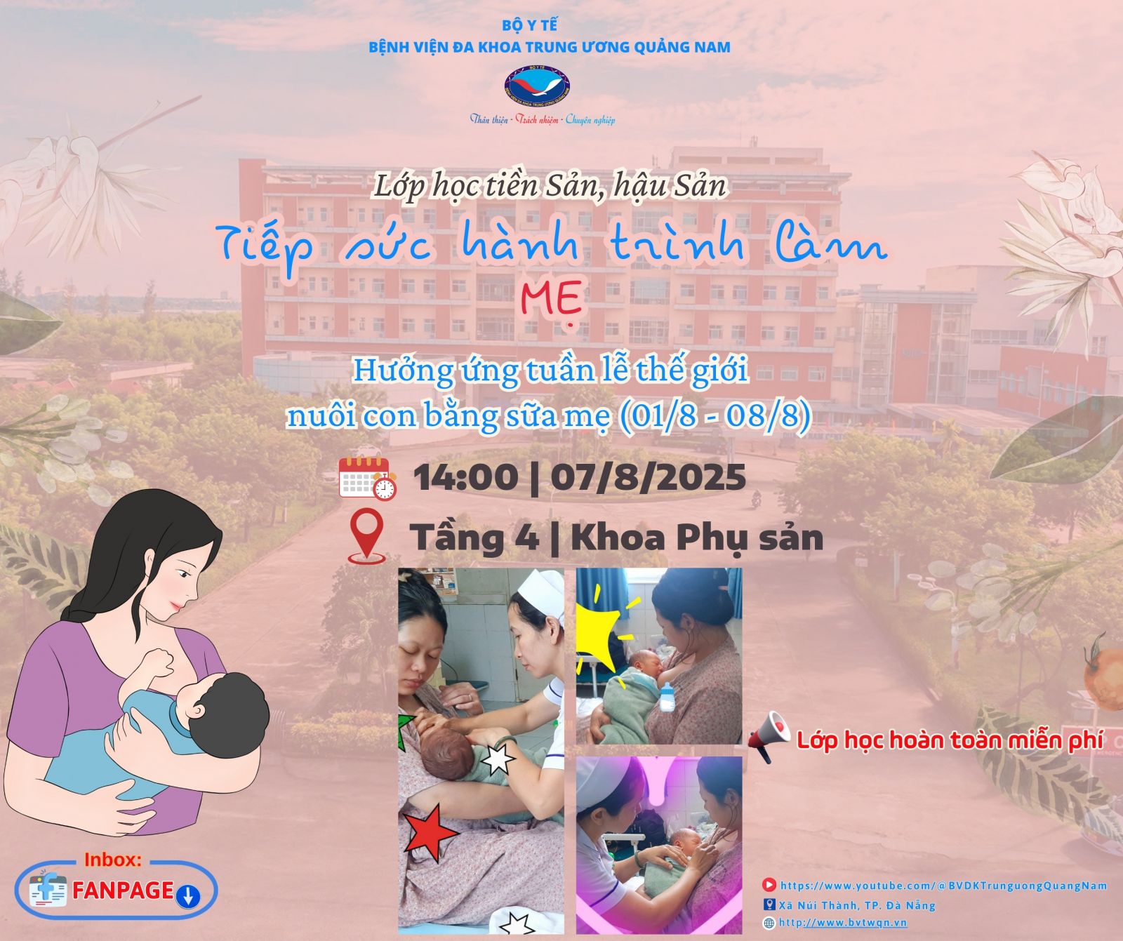 DKTWQNO - Hành trình làm mẹ luôn đầy ắp yêu thương nhưng cũng không ít bỡ ngỡ, nhất là với những ai lần đầu mang thai, sinh con. Thấu hiểu điều đó, chiều ngày 07/8/2025, Bệnh viện Đa khoa Trung ương Quảng Nam (trú tại xã Núi Thành, TP. Đà Nẵng) sẽ tổ chức lớp học tiền sản – hậu sản với chủ đề: "Tiếp sức hành trình làm MẸ", tại tầng 4 – Khoa Phụ sản nhằm Hướng ứng Tuần lễ Thế giới nuôi con bằng sữa mẹ (01/8 – 08/8).