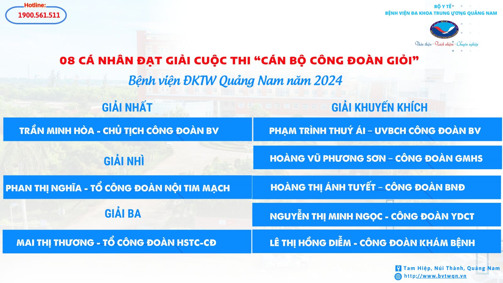 Từ ngày 17/10 đến hết ngày 31/10, Công đoàn cơ sở Bệnh viện Đa khoa Trung ương Quảng Nam đã tổ chức cuộc thi “Cán bộ Công đoàn giỏi 2024” trong toàn viện dành cho Tổ trưởng các Tổ công đoàn, Uỷ viên BCH công đoàn, Uỷ viên ban kiểm tra công đoàn từ kết quả thi trực tuyến trên trang thông tin điện tử Công đoàn Y tế Việt Nam. Ngày 15/11, Ban tổ chức thông báo kết quả chung cuộc, 08 cá nhân đạt giải với 1 giải nhất, 1 giải nhì, 1 giải ba và 5 giải khuyến khích.