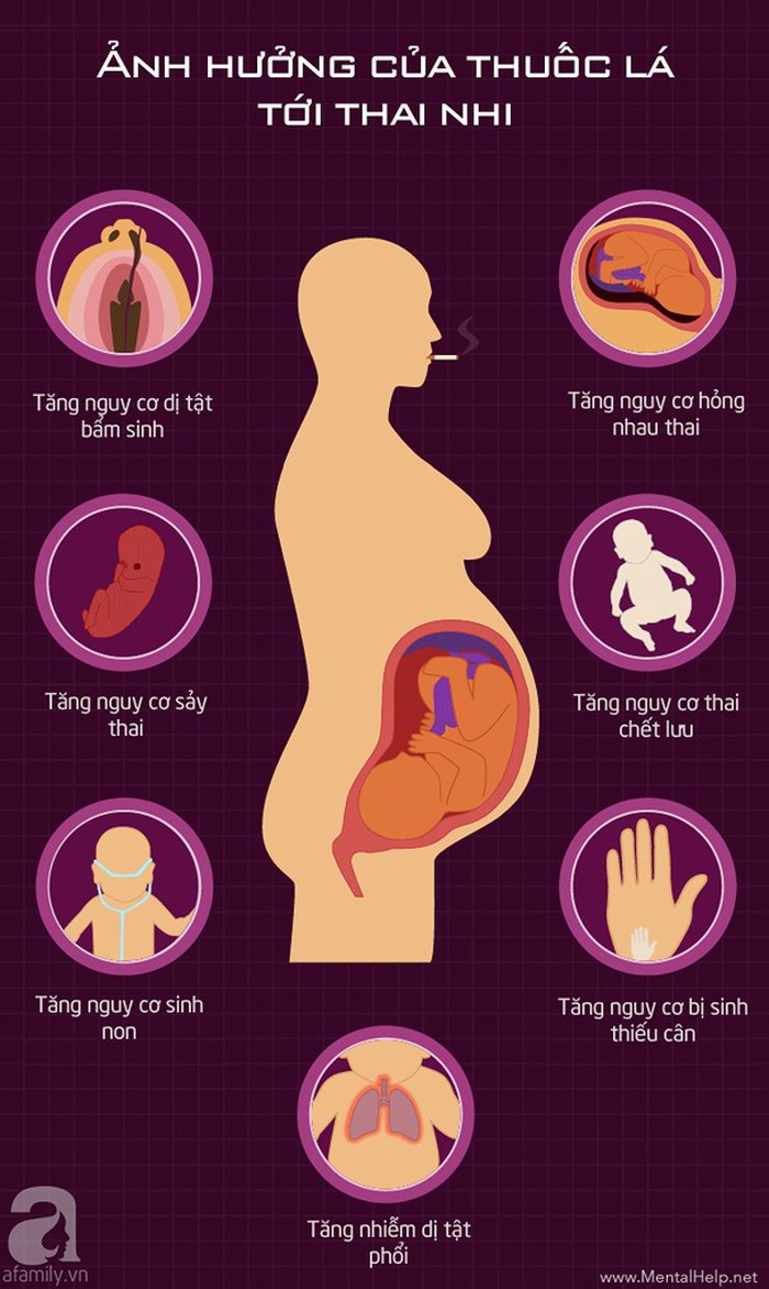 Theo các nhà nghiên cứu, phụ nữ mang thai dù hút thuốc lá trực tiếp hay hút thuốc lá thụ động (ngửi phải khói thuốc) rất có thể dẫn đến thai chết lưu, sinh non, sinh con nhẹ cân, tăng nguy cơ dị tật bẩm sinh…