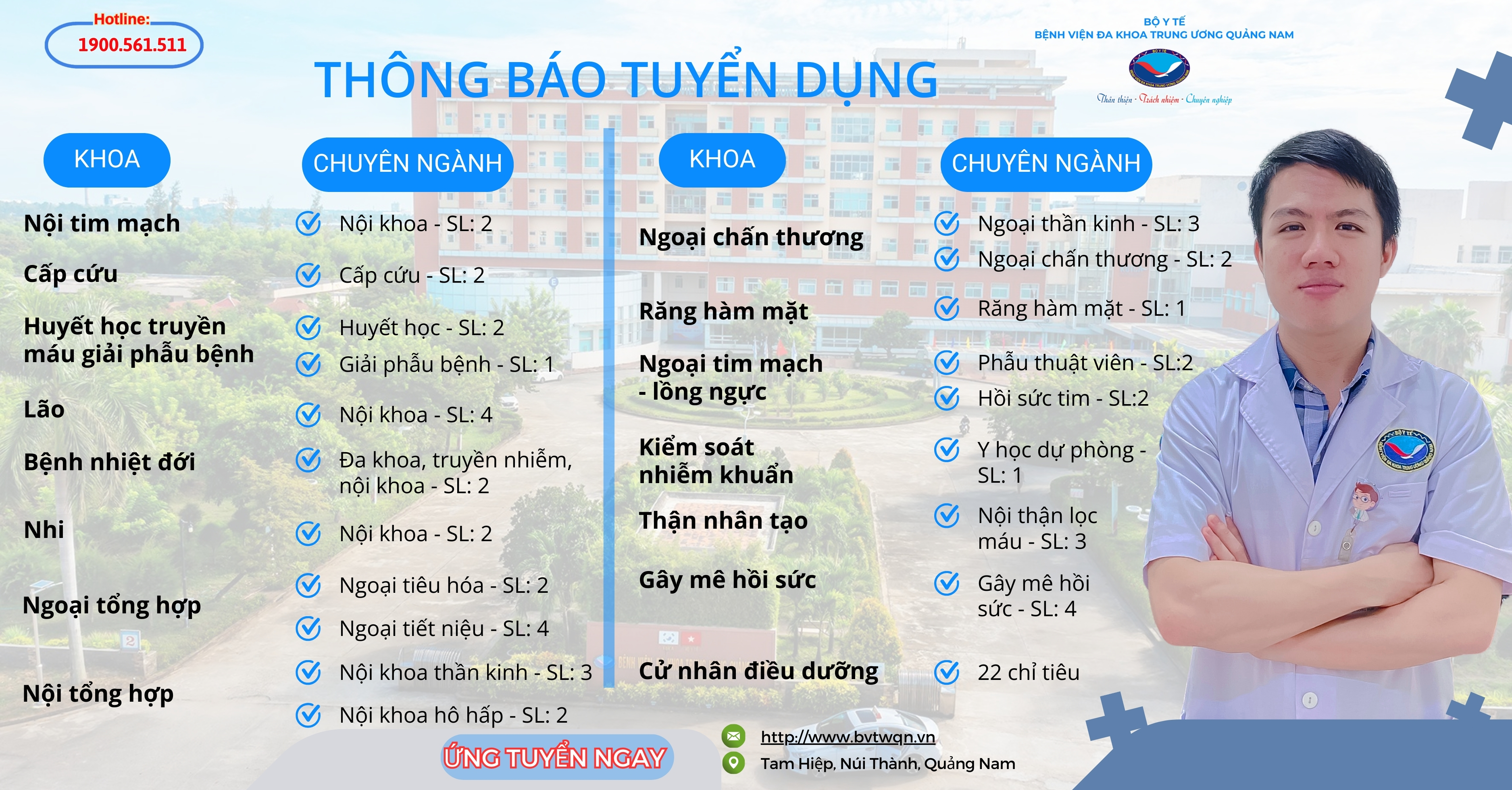 Nay Bệnh viện xin thông báo tuyển dụng số lượng: 44 chỉ tiêu bác sĩ và 22 chỉ tiêu điều dưỡng. Thông tin các vị trí cụ thể đính kèm theo hình ảnh bên dưới.