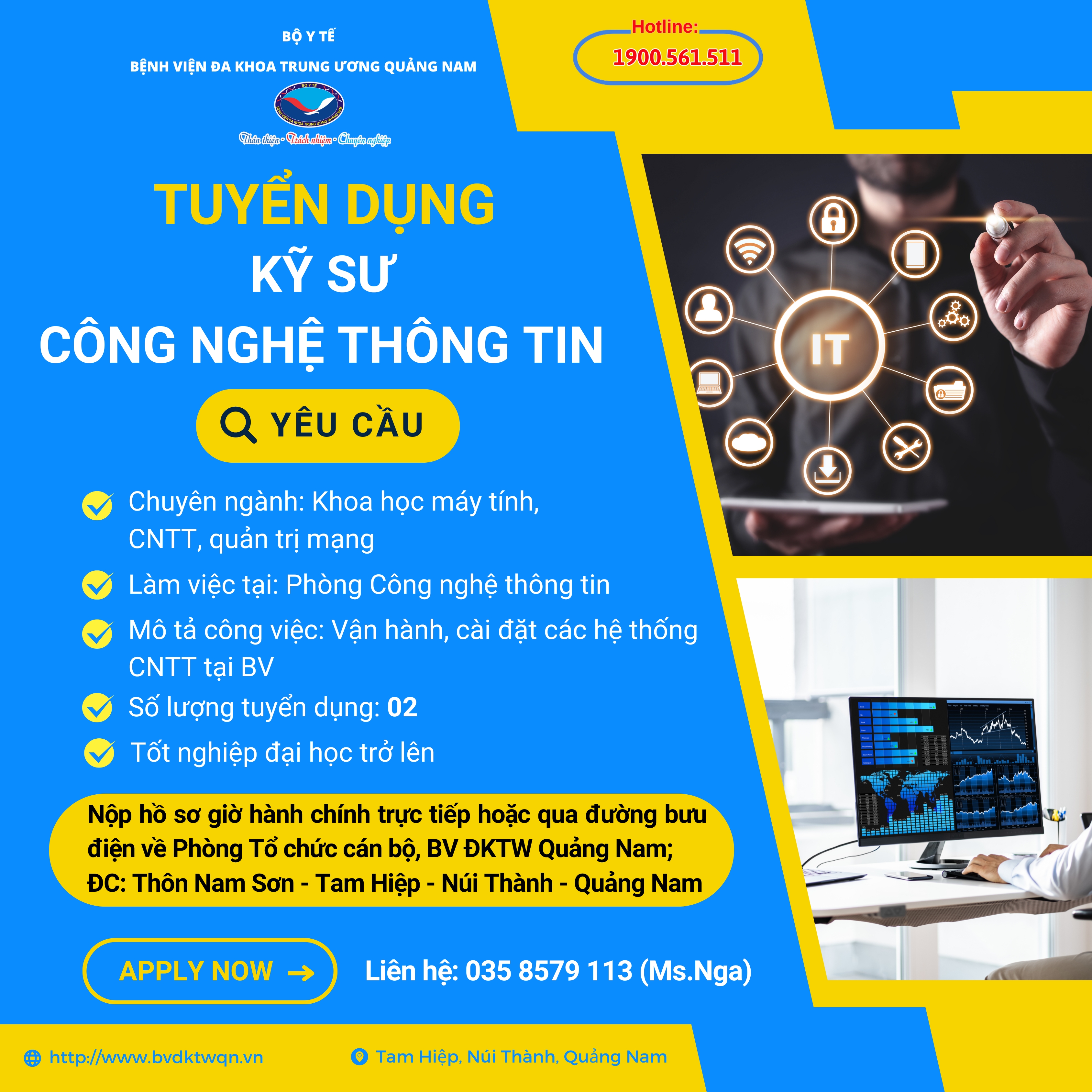Với nhu cầu phát triển ứng dụng công nghệ thông tin 4.0 trong xu hướng bệnh viện thông minh, Bệnh viện Đa khoa Trung ương Quảng Nam Tuyển dụng số lượng 02 nhân sự Kỹ sư Công nghệ thông tin, cụ thể như sau: