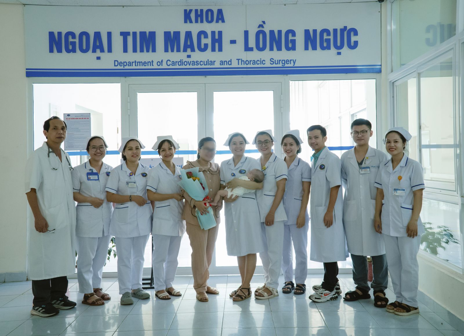 Đội ngũ y bác sĩ Khoa Ngoại tim mạch lồng ngực chụp hình cùng mẹ và bé T.