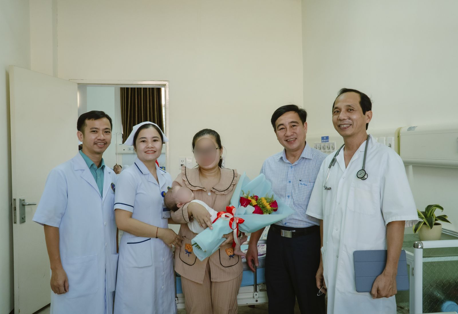 Ban lãnh đạo Bệnh viện tặng hoa chúc mừng bệnh nhi hơn 3 tháng tuổi mổ tim hở tại viện được xuất viện.