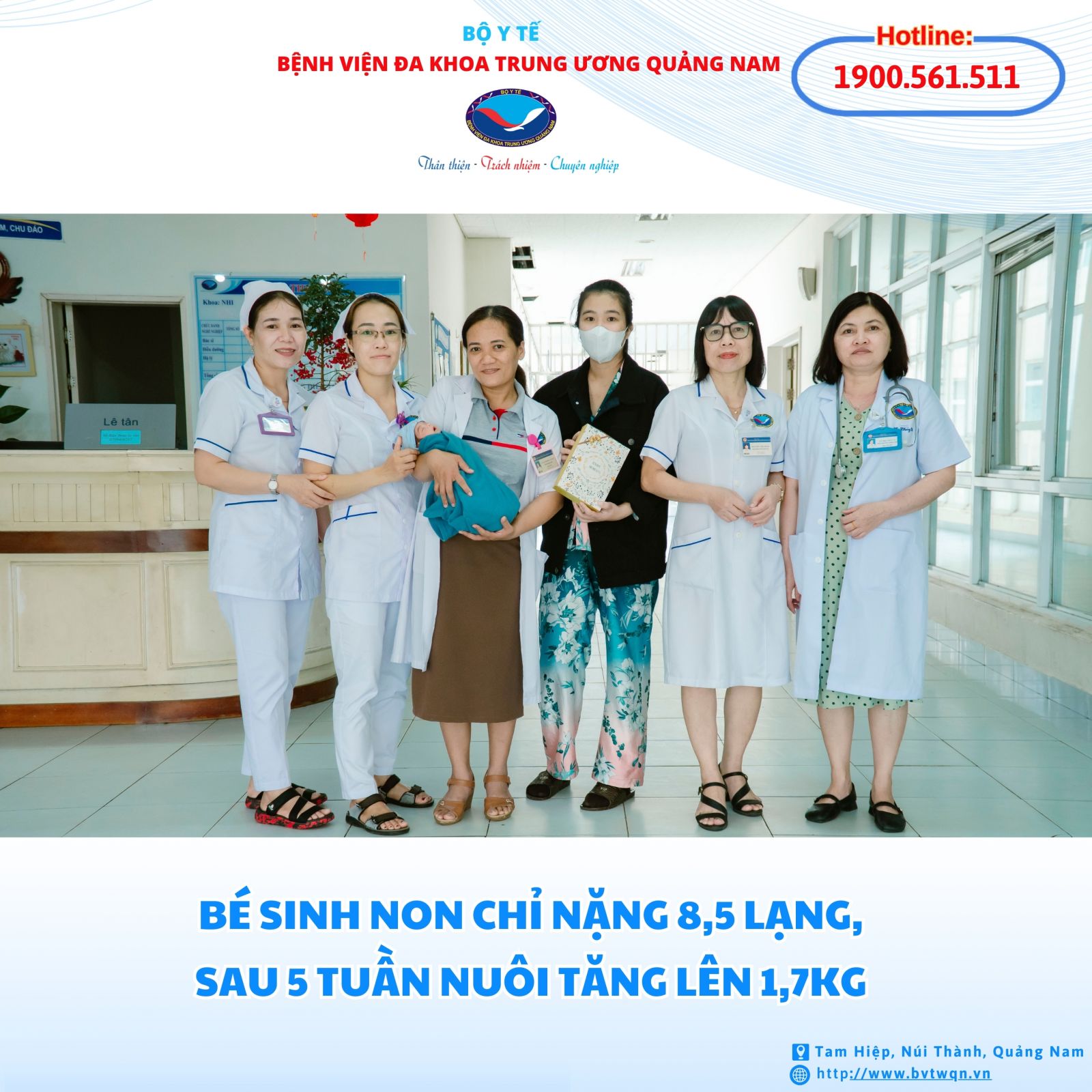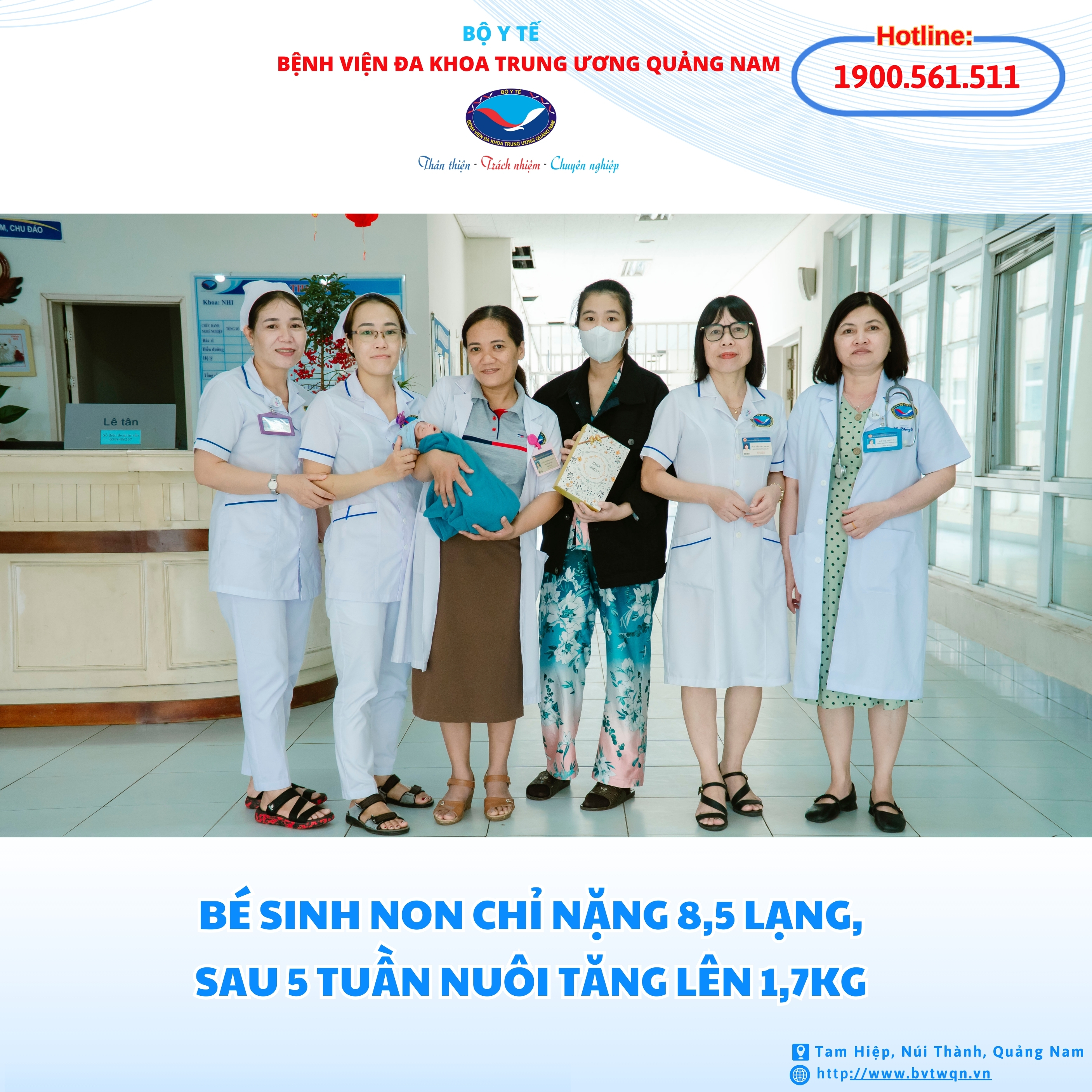 (TWQN) - Sinh non ở tuần thứ 30, bé gái chào đời chỉ nặng 850gram, sau khi bắt thai thì bé tím, nhịp tự thở yếu, suy hô hấp, nhiễm trùng sơ sinh, bệnh màng trong… Sau 5 tuần điều trị, chăm sóc tại Hồi sức sơ sinh thuộc Khoa Nhi - Bệnh viện Đa khoa Trung ương Quảng Nam, bé được xuất viện vào sáng nay 15/3, cân nặng 1,7kg.