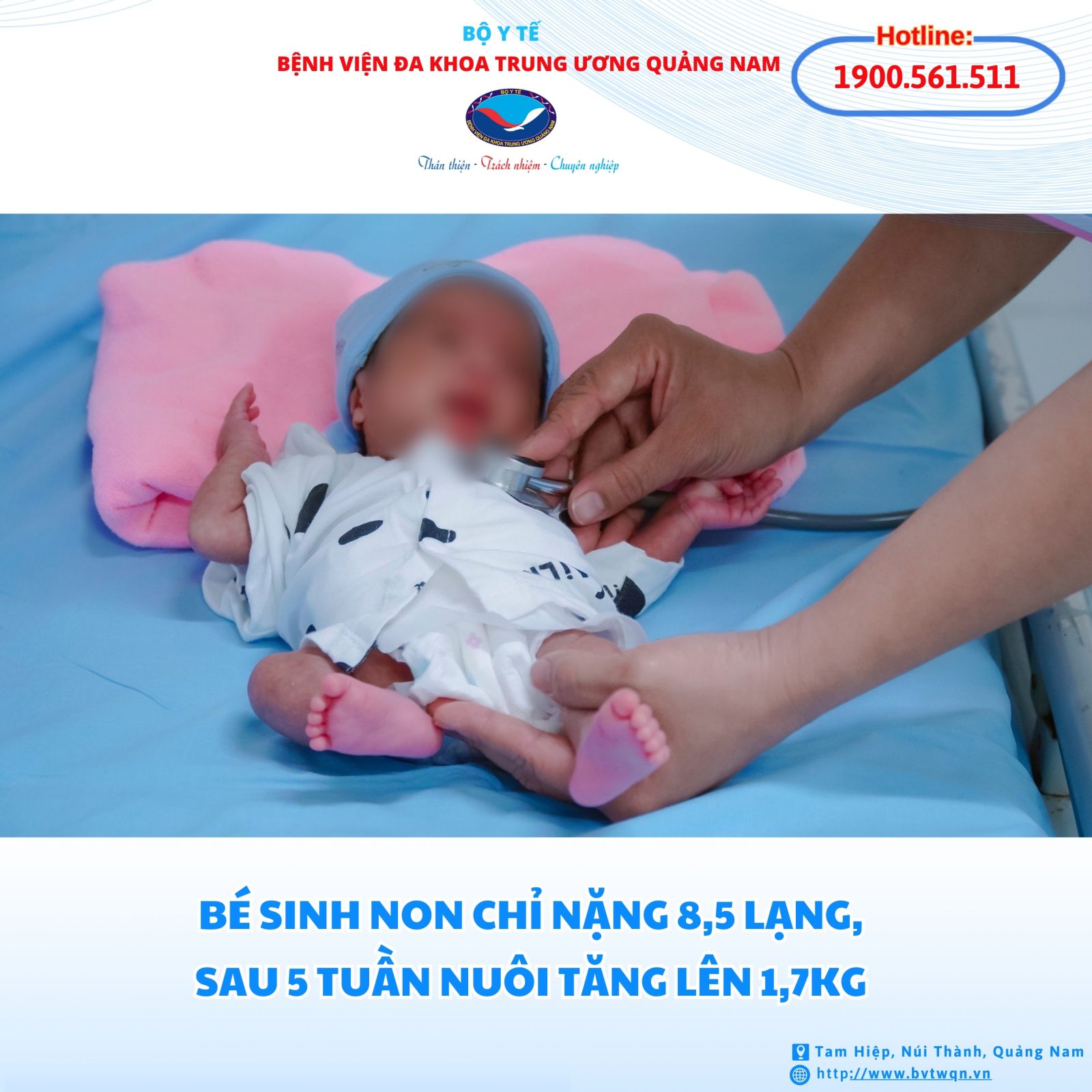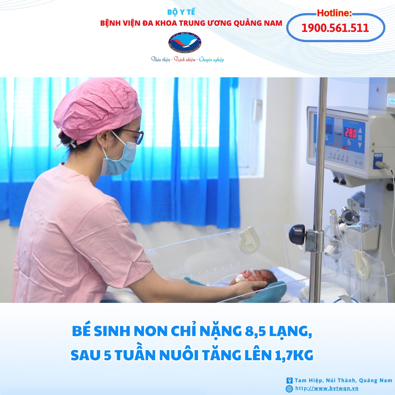 Hôm nay 15/3, Bệnh viện Đa khoa Trung ương Quảng Nam cho biết, đơn vị vừa nuôi sống thành công bé gái sinh non 30 tuần sau hơn 5 tuần điều trị, chăm sóc tích cực. Đây là bé sinh non trọng lượng nhỏ nhất từ trước đến nay tại bệnh viện này.
