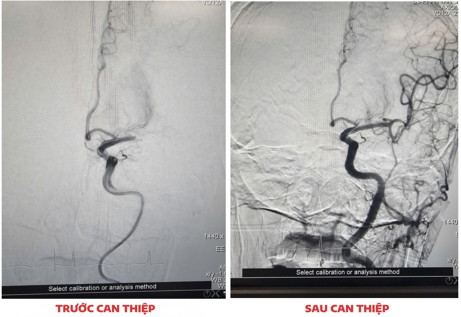 Hình ảnh động mạch não người bệnh tắc hoàn toàn nhánh M1 động mạch não giữa bên trái và sau can thiệp tái thông hoàn toàn nhánh M1.