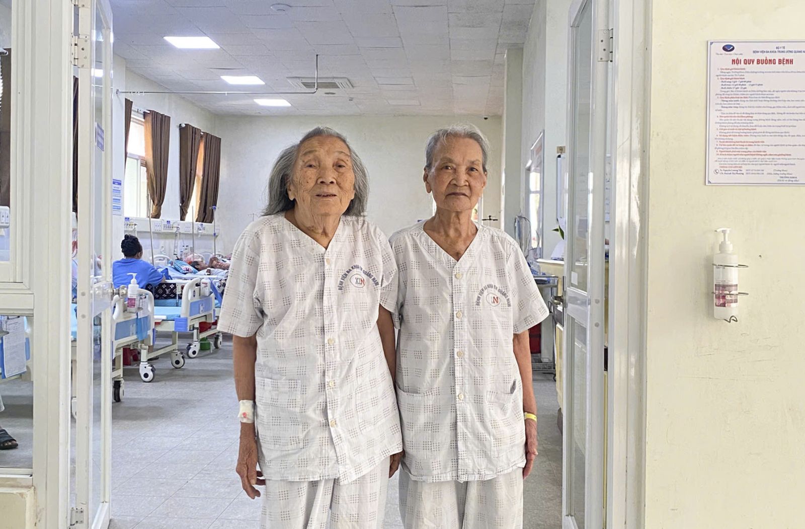 Hai cụ bà lớn tuổi bà Châu và bà Hùng (từ trái sang) sức khỏe ổn định sau ca đại phẫu thuật mổ tim hở.