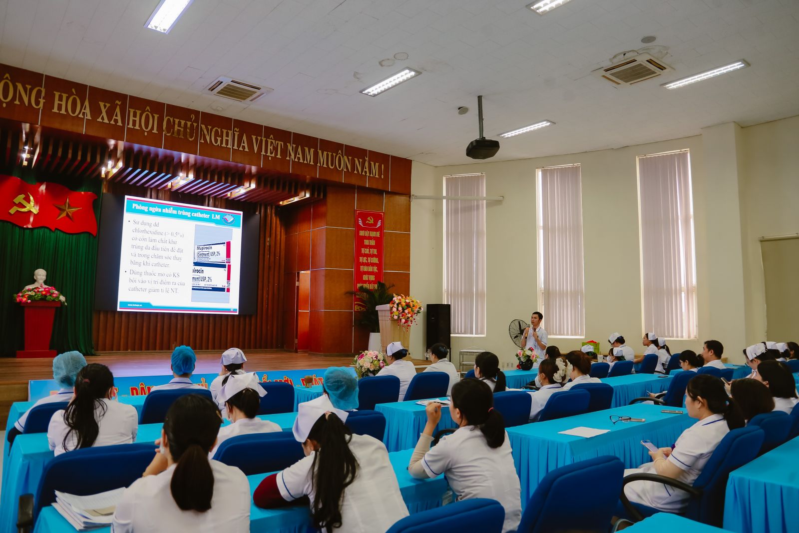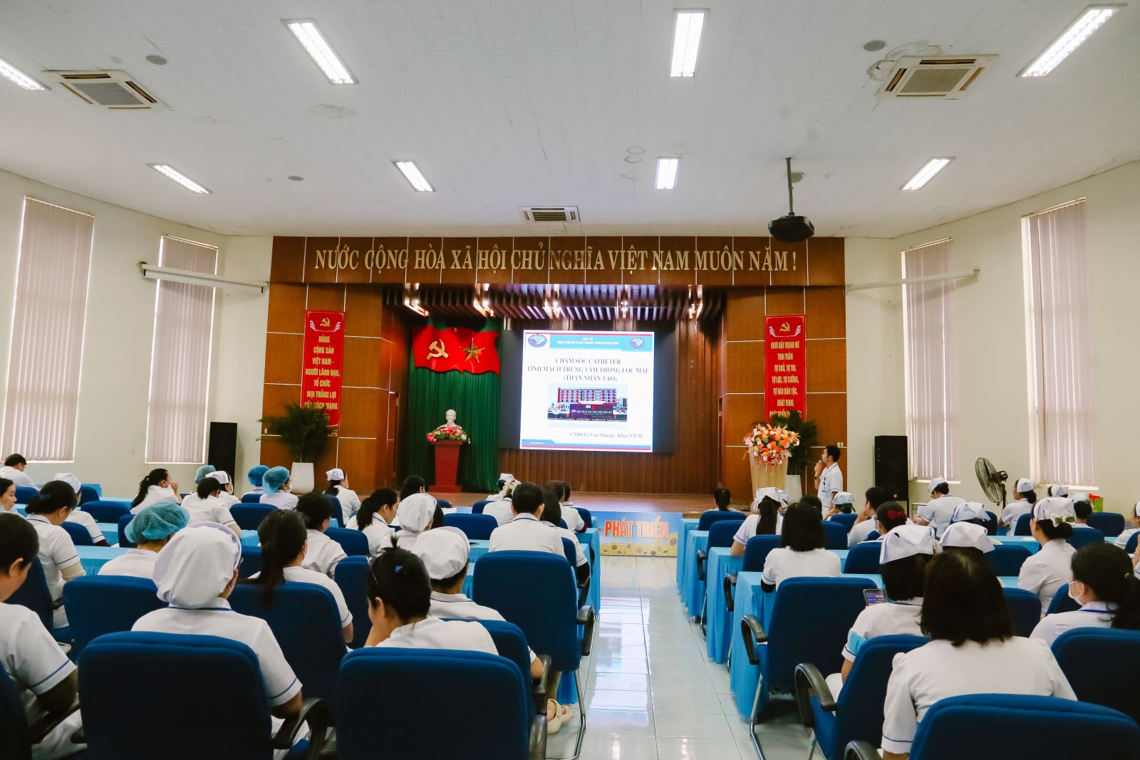 DKTWQNO - Ngày 03/12/2025, phòng Điều dưỡng Bệnh viện Đa khoa Trung ương Quảng Nam tổ chức buổi sinh hoạt chuyên môn với chủ đề “Chăm sóc Catheter tĩnh mạch trung tâm trong lọc máu” tại Hội trường lớn.
