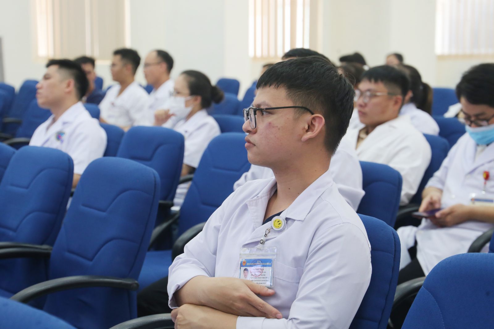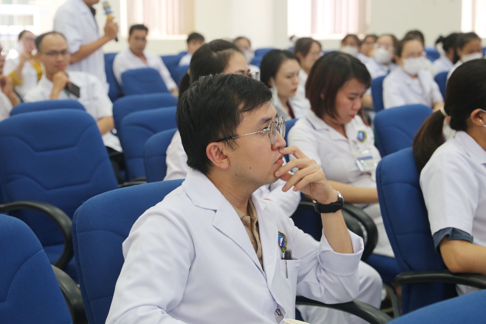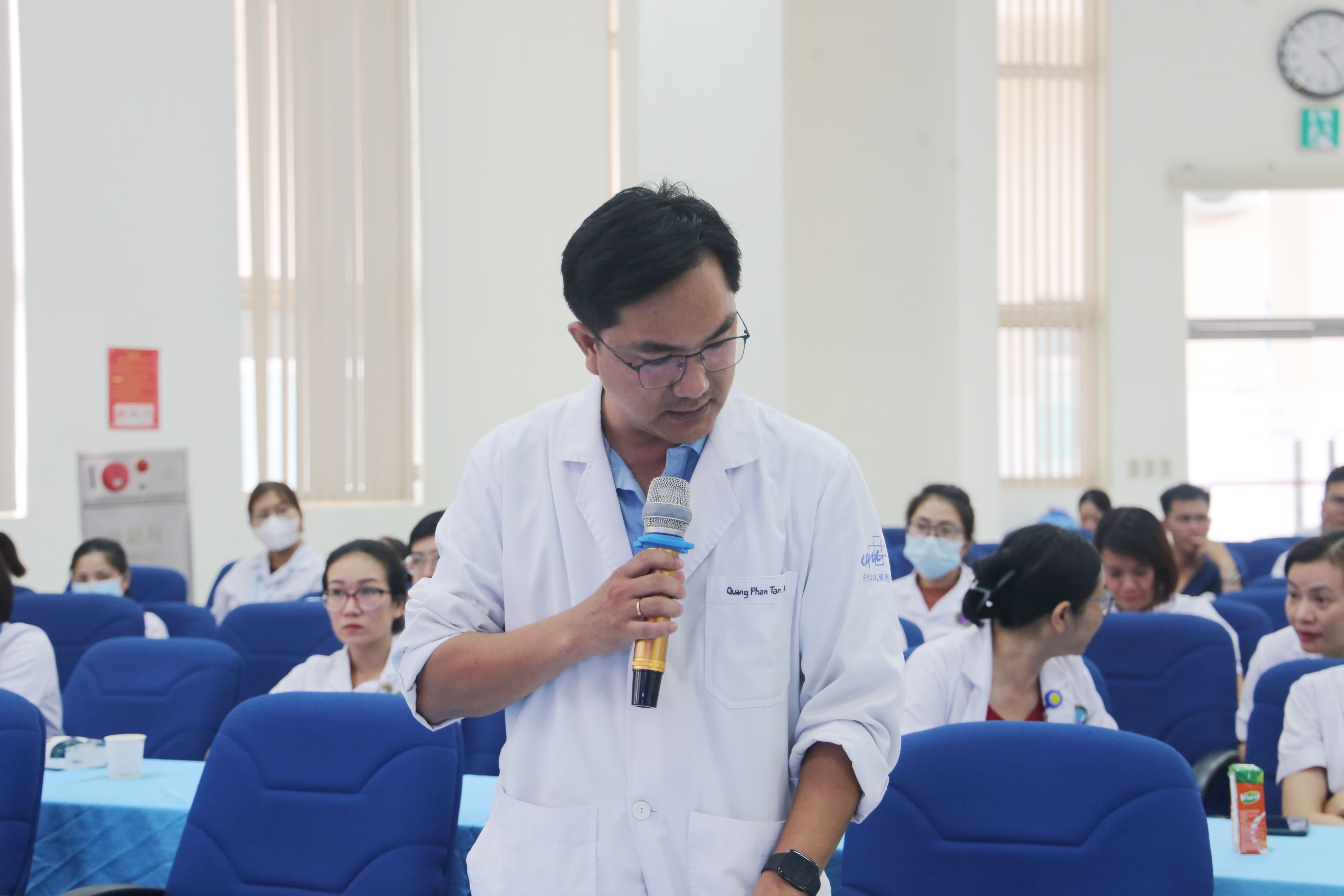 TS.BS Phan Tấn Quang-Trưởng phòng Kế hoạch tổng hợp/Trưởng khoa Nội tim mạch chủ trì và điều hành buổi sinh hoạt cùng sự tham gia của gần 100 thành viên là lãnh đạo các khoa/phòng, Bác sĩ, Dược sĩ trong toàn Bệnh viện.