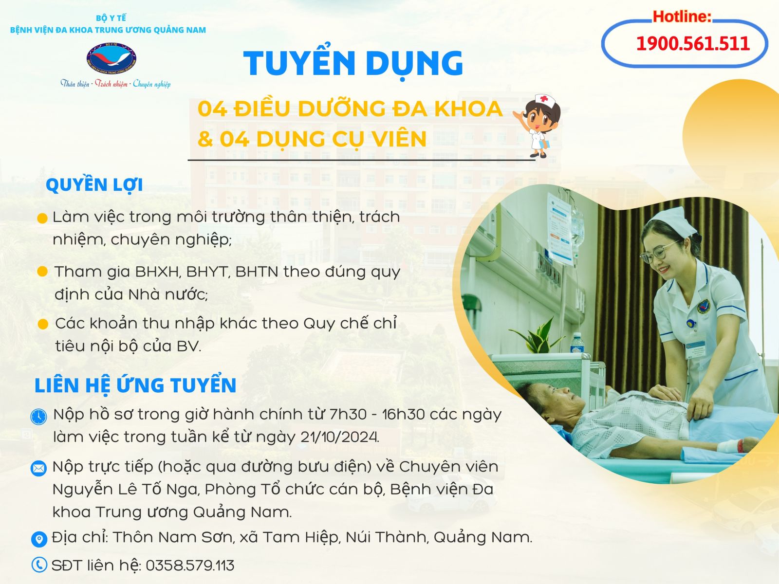 Bệnh viện Đa khoa Trung ương Quảng Nam thông tin tuyển dụng nhân sự điều dưỡng tháng 10 năm 2024 cụ thể như sau:
