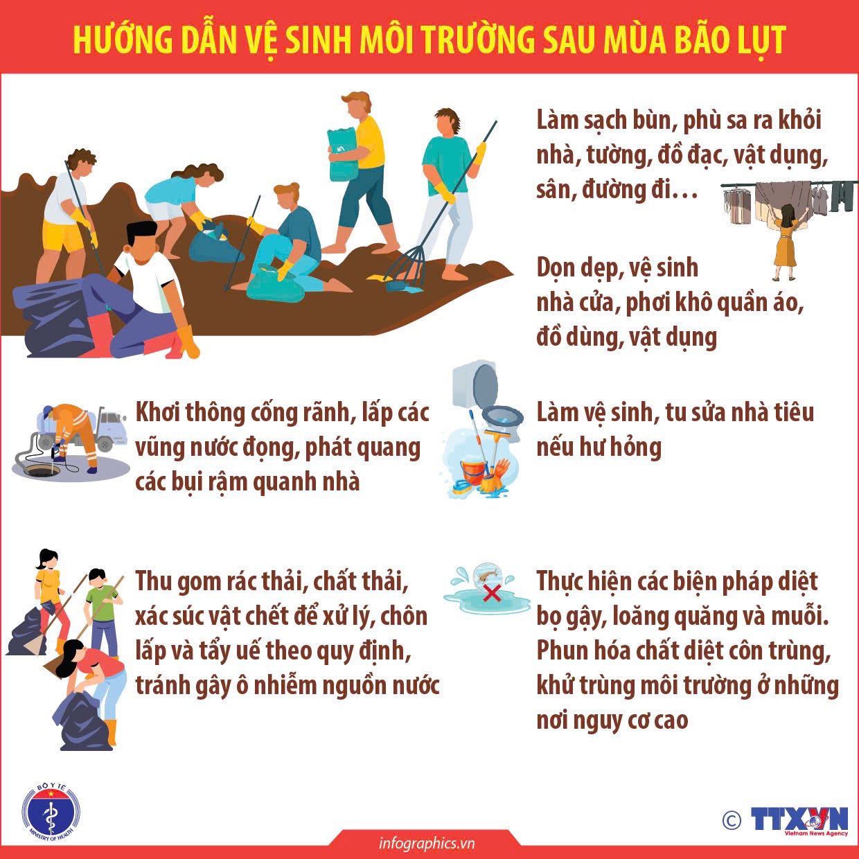 - Dọn bùn, rác, xác động vật chết; khơi thông cống rãnh; phun hóa chất diệt muỗi, côn trùng tại nơi nước đọng.