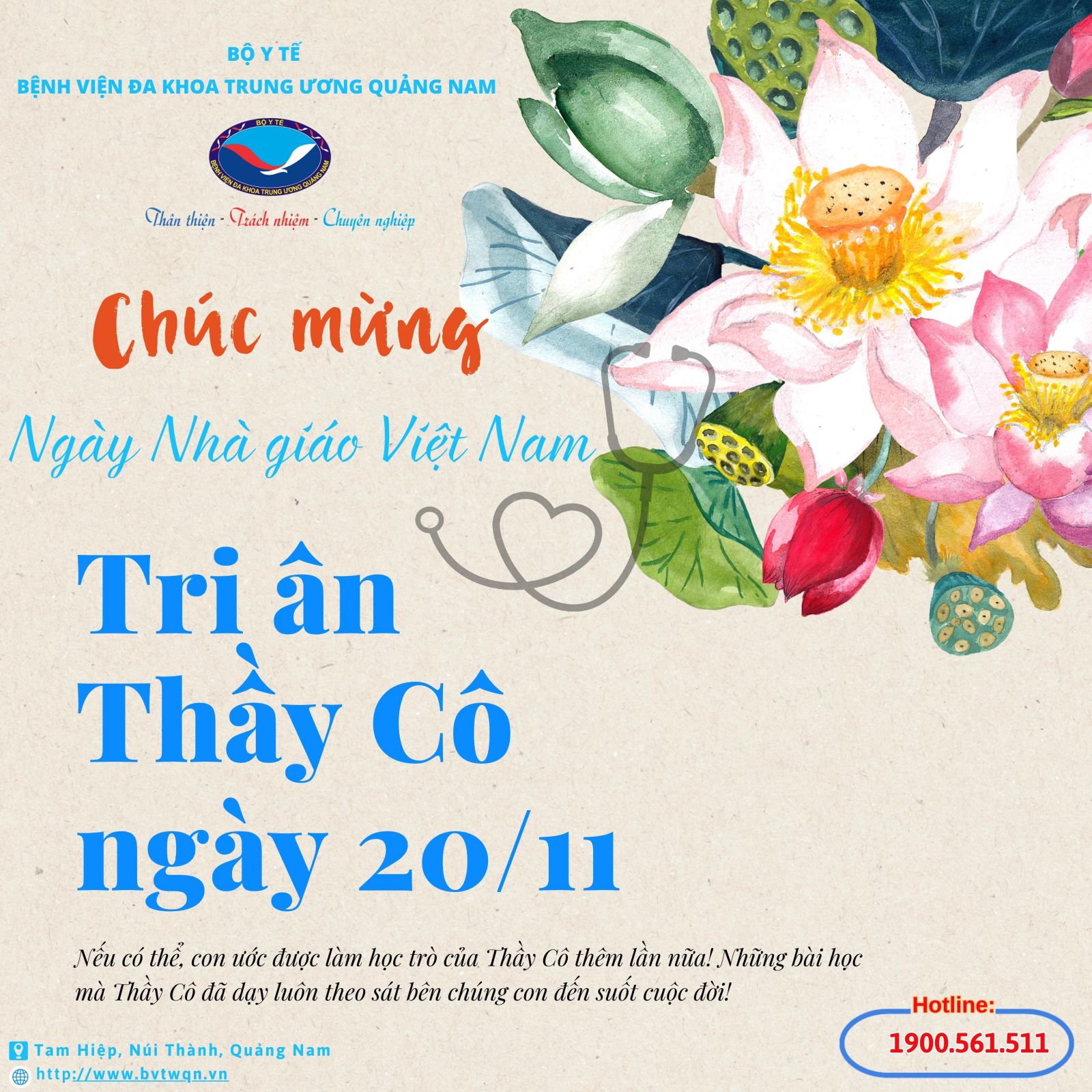 Nhân ngày Nhà giáo Việt Nam 20/11, Bệnh viện Đa khoa Trung ương Quảng Nam xin gửi lời chúc mừng và tri ân đến các thầy cô giáo, đặc biệt là những nhà giáo – bác sĩ đáng kính của nhân dân, chúc các thầy cô có thật nhiều sức khỏe, tiếp tục cống hiến hết mình, đạt được nhiều thành tựu trong sự nghiệp giáo dục và chăm sóc, bảo vệ sức khỏe cho nhân dân.