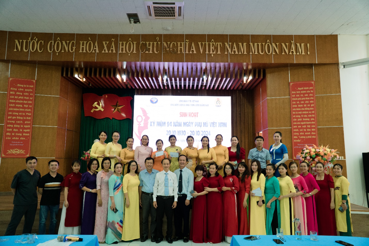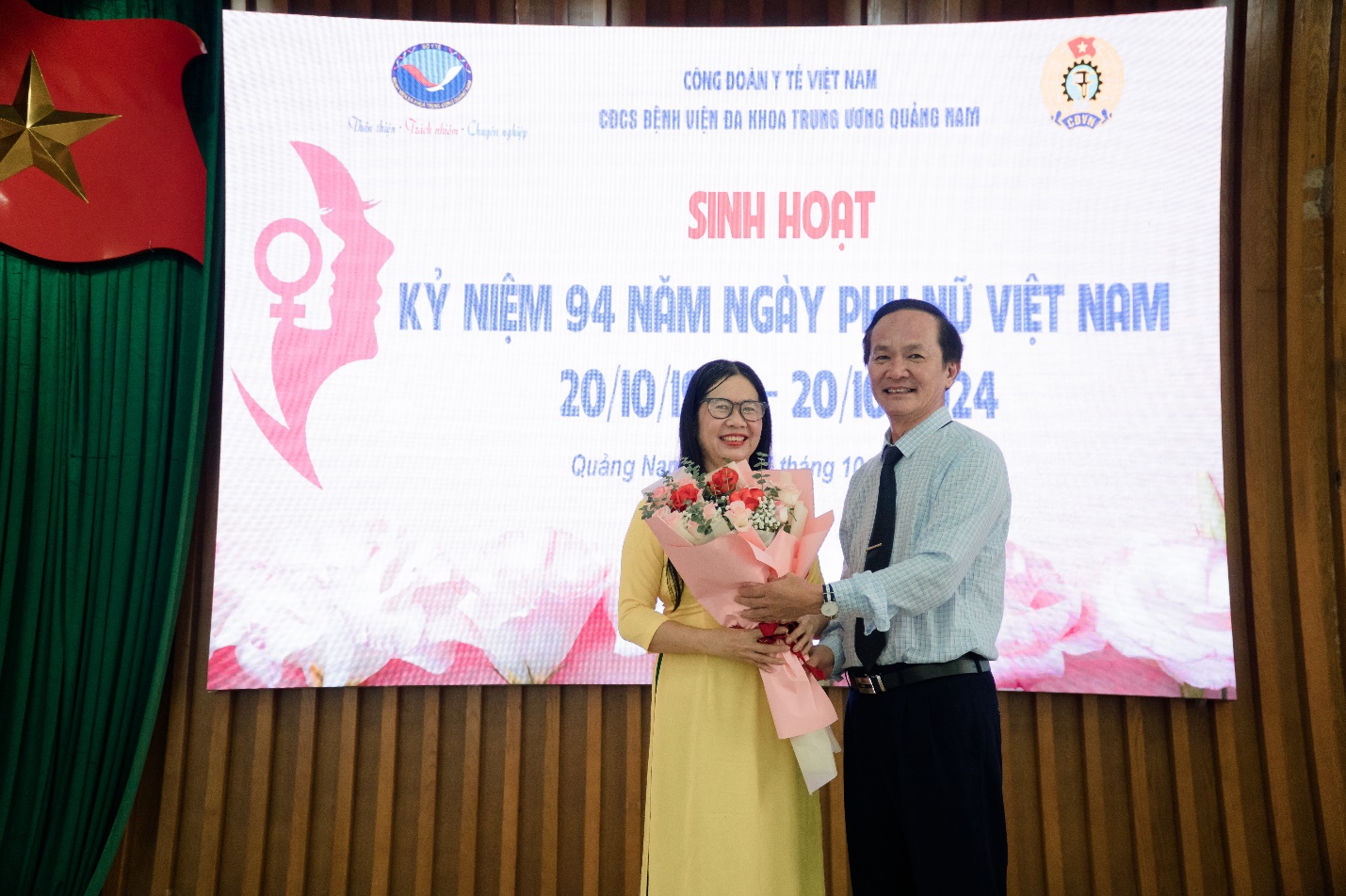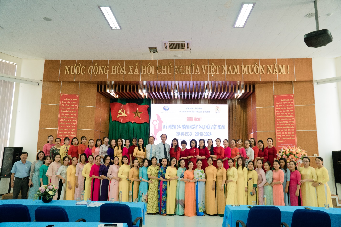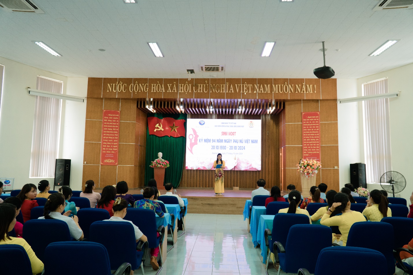Tham dự Lễ Kỷ niệm 94 năm Ngày Thành lập Hội Liên hiệp Phụ nữ Việt Nam 20/10 năm nay là sự có mặt của DSCKII. Lương Tấn Đức – Phó Giám đốc Bệnh viện; ThS. Trần Minh Hòa – Chủ tịch Công đoàn Bệnh viện cùng đông đủ nữ cán bộ, viên chức và người lao động Bệnh viện tới tham dự.