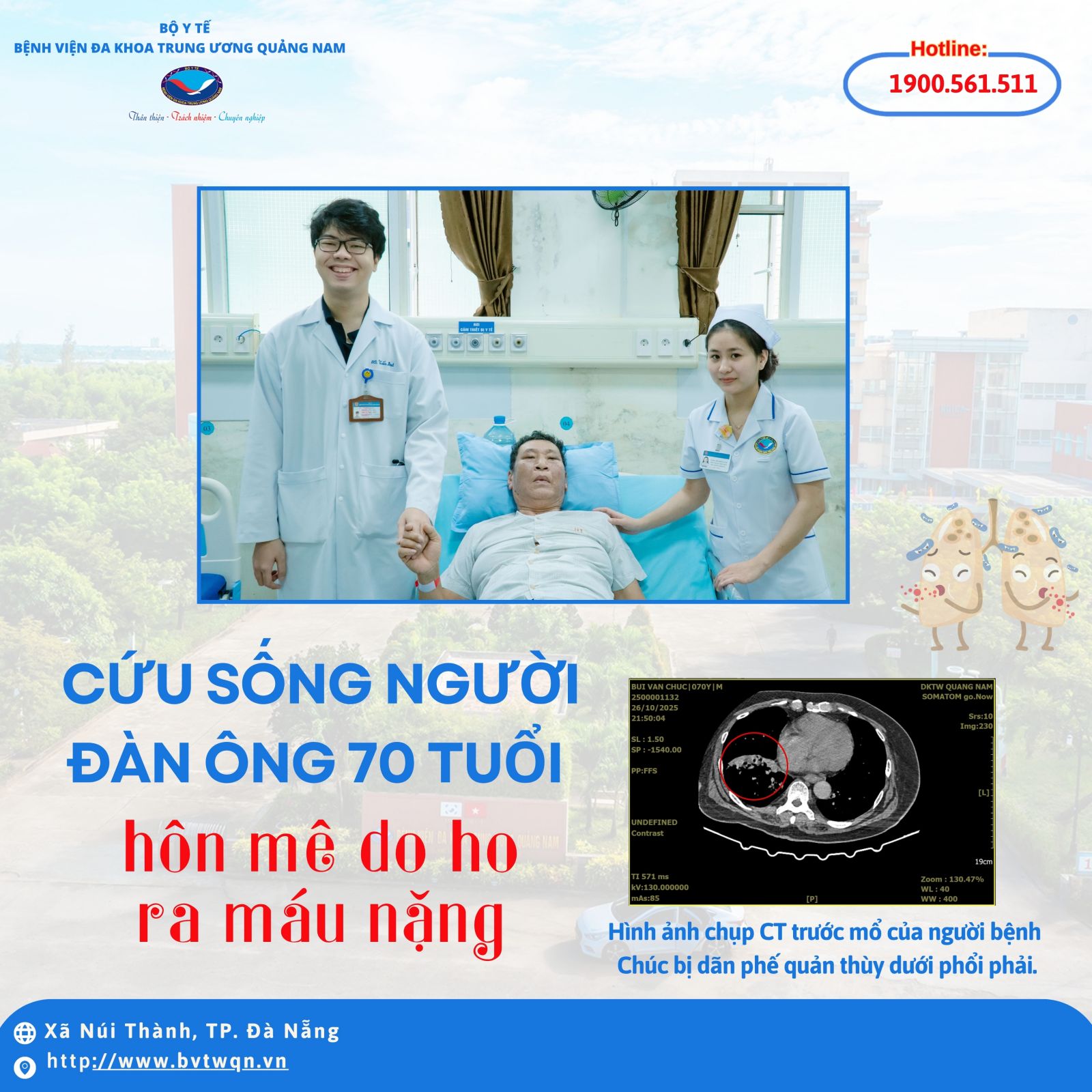 DKTWQNO - Ngày 11/11, Bệnh viện Đa khoa Trung ương Quảng Nam cho biết, một người đàn ông 70 tuổi ở xã Núi Thành, TP. Đà Nẵng đã được đơn vị cứu sống sau khi rơi vào hôn mê sâu vì ho ra máu nặng nguyên nhân từ phổi, nhờ phát hiện sớm và xử trí kịp thời.