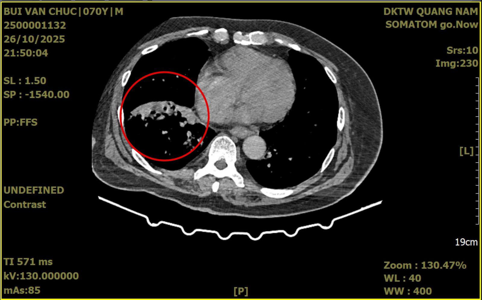 Người bệnh Bùi Văn Chúc (70 tuổi, trú tại xã Núi Thành, TP. Đà Nẵng) được người nhà đưa đến Bệnh viện vào đêm 26/10/2025 trong tình trạng hôn mê, khó thở, ho ra máu nhiều, gây suy hô hấp nặng. Kết quả đo cho thấy nồng độ oxy trong máu động mạch (SpO₂) chỉ còn 65%.