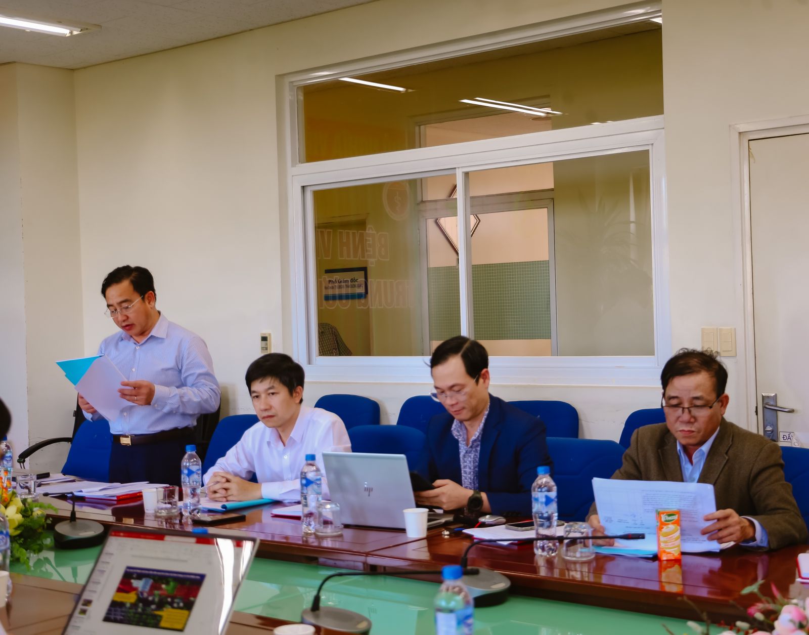 Đồng chí BSCKII. Nguyễn Đình Hùng – Bí thư Đảng ủy, Giám đốc Bệnh viện trình bày dự thảo Báo cáo kiểm điểm tập thể Đảng ủy năm 2025.