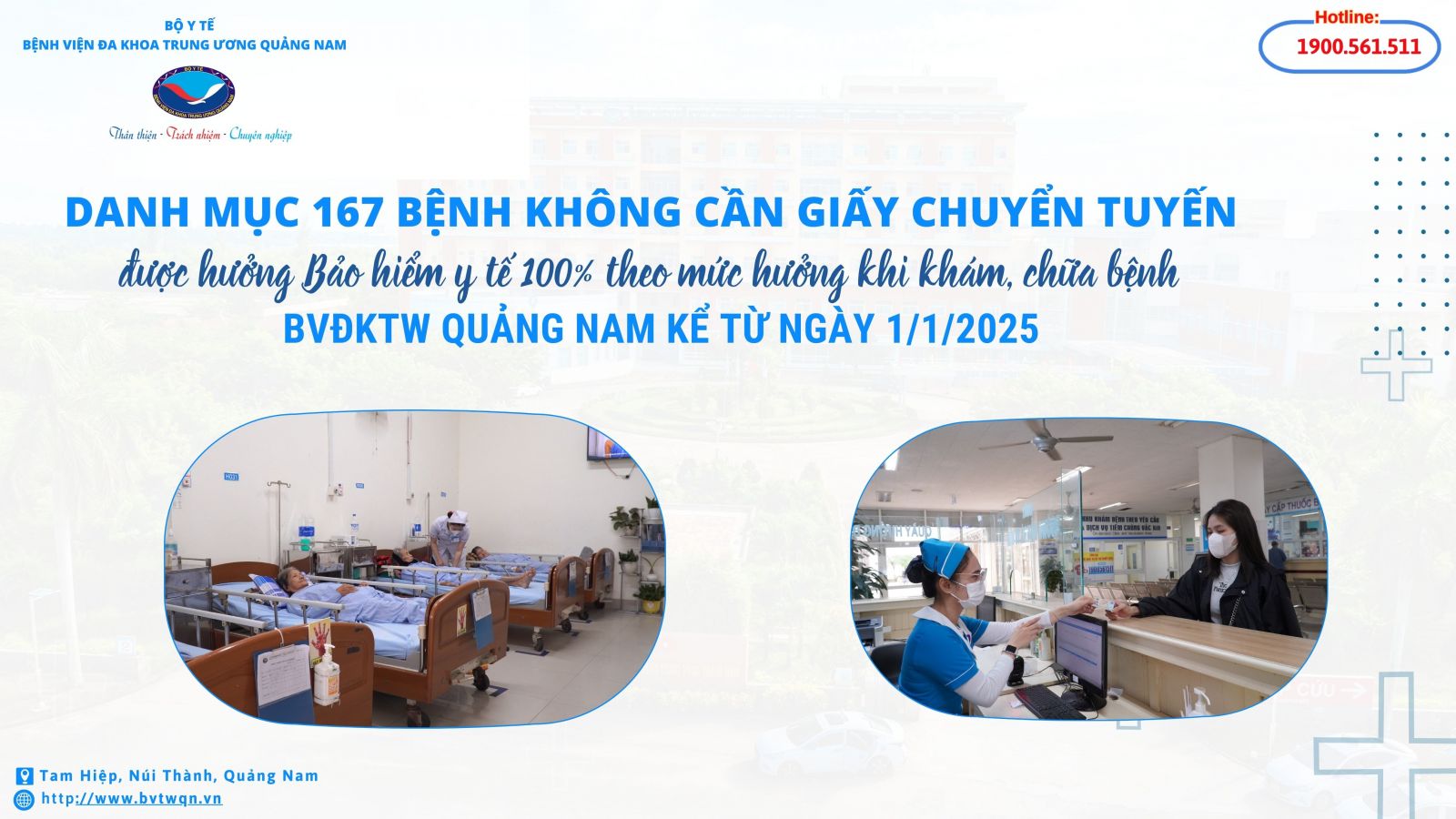 Danh mục 167 bệnh không cần giấy chuyển tuyến được hưởng Bảo hiểm y tế 100% theo mức hưởng khi khám, chữa bệnh BVĐKTW Quảng Nam kể từ ngày 1/1/2025
