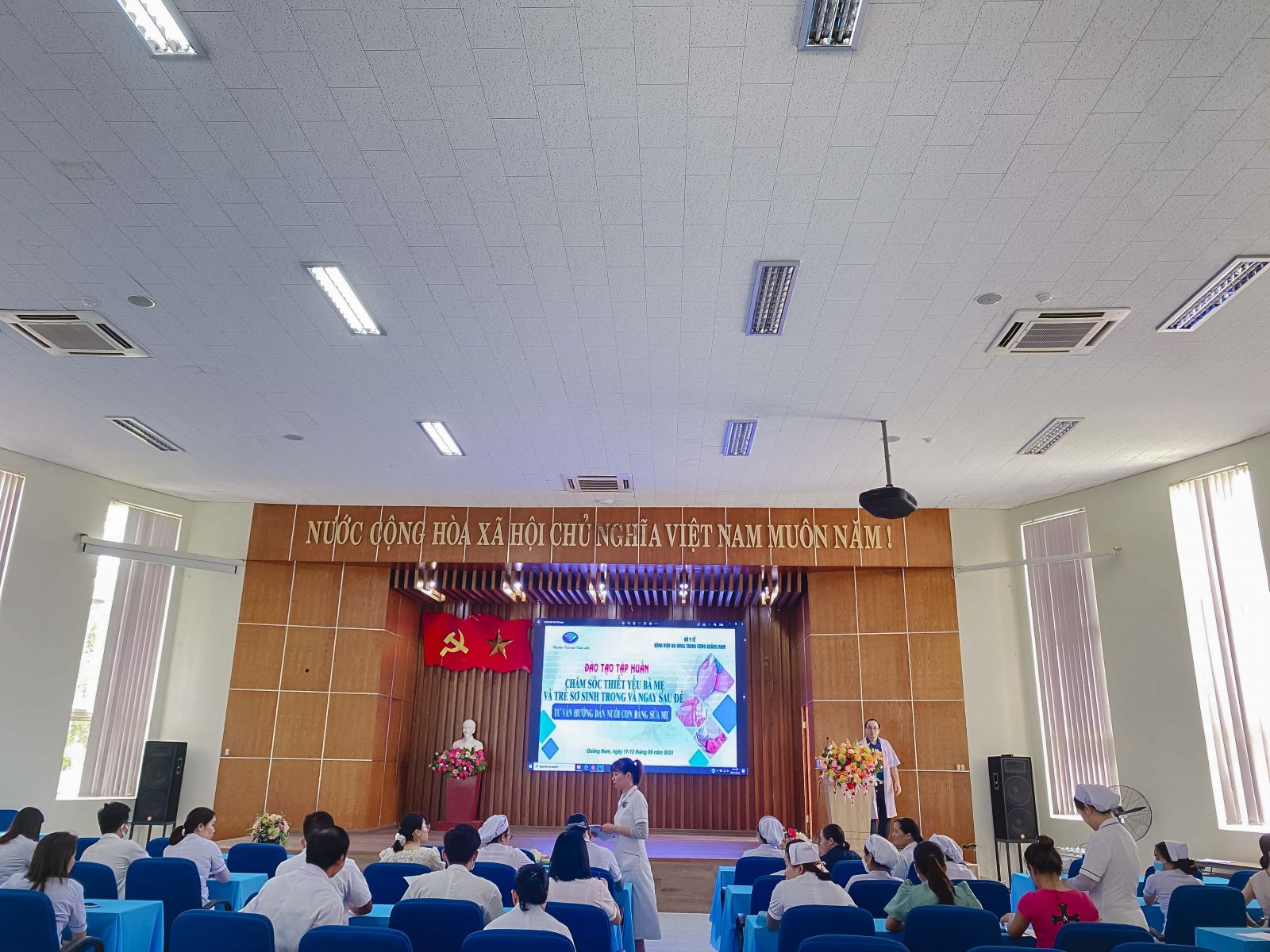 Trong 2 ngày 11 và 12/09, Bệnh viện Đa khoa Trung ương Quảng Nam tổ chức lớp đào tạo tập huấn về chăm sóc thiết yếu bà mẹ, trẻ sơ sinh trong và ngay sau đẻ, cạnh đó còn có về tư vấn hướng dẫn nuôi con bằng sữa mẹ năm 2023.