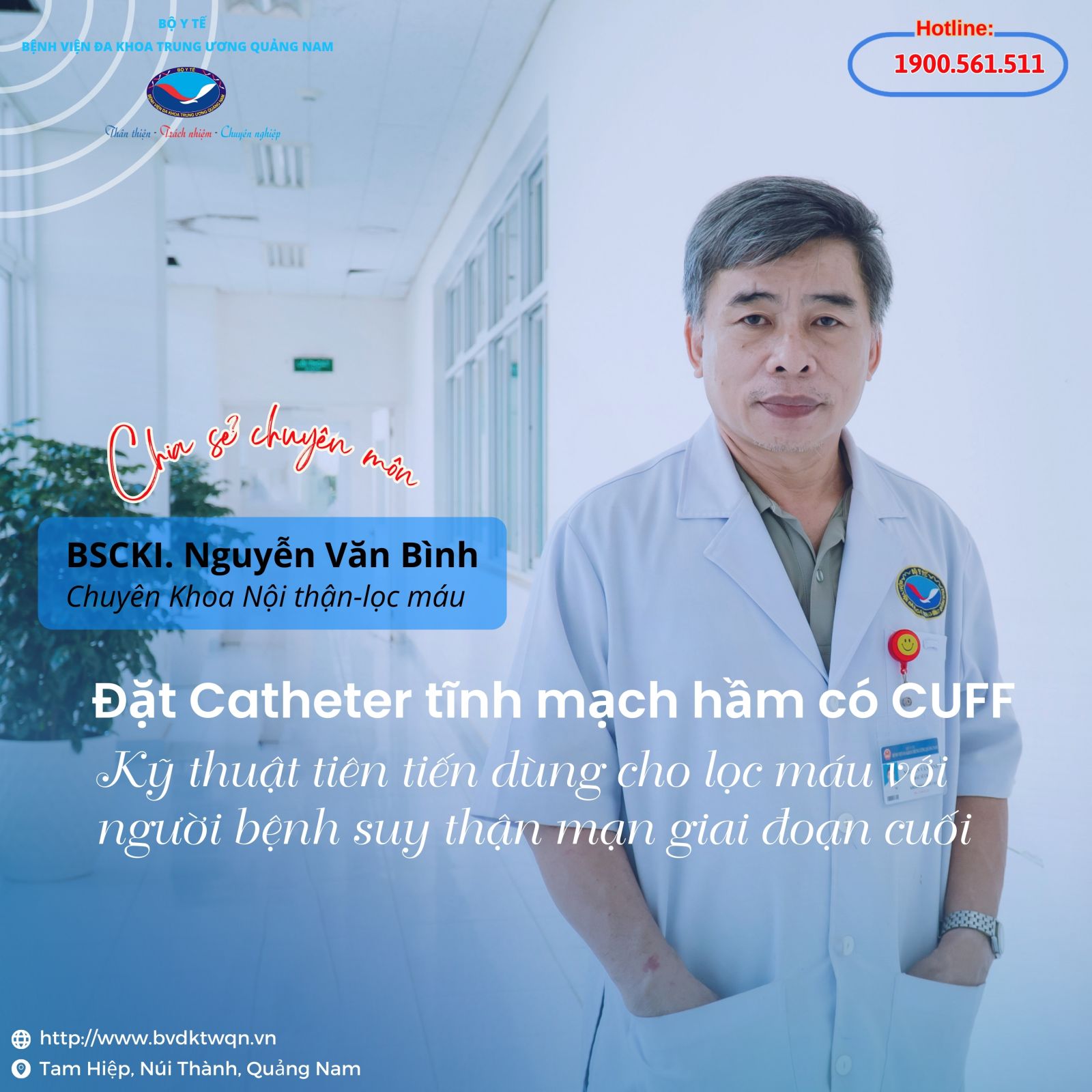 Tại Khoa Nội thận - lọc máu, Bệnh viện Đa khoa Trung ương Quảng Nam, với đội ngũ bác sỹ tận tâm, giàu kinh nghiệm, luôn tuân thủ thực hiện các qui trình kỹ thuật một cách nghiêm ngặt theo hướng dẫn của Bộ Y tế. Cùng với hệ thống trang thiết bị tiên tiến, kỹ thuật đặt Catheter tĩnh mạch hầm có cuff được thực hiện đã đáp ứng yêu cầu điều trị, nâng cao chất lượng cuộc sống cho mỗi người bệnh suy thận.