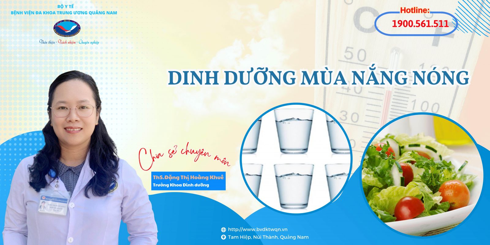 Điều kiện thời tiết như vậy, mọi người cần có một chế độ dinh dưỡng hợp lý để đảm bảo sức khỏe đồng thời bù lại lượng nước và khoáng chất cho cơ thể. Cùng đến với chia sẻ chuyên môn của ThS. Đặng Thị Hoàng Khuê, Trưởng Khoa Dinh dưỡng, Bệnh viện Đa khoa Trung ương Quảng Nam về nội dung: “Dinh dưỡng mùa nắng nóng”.