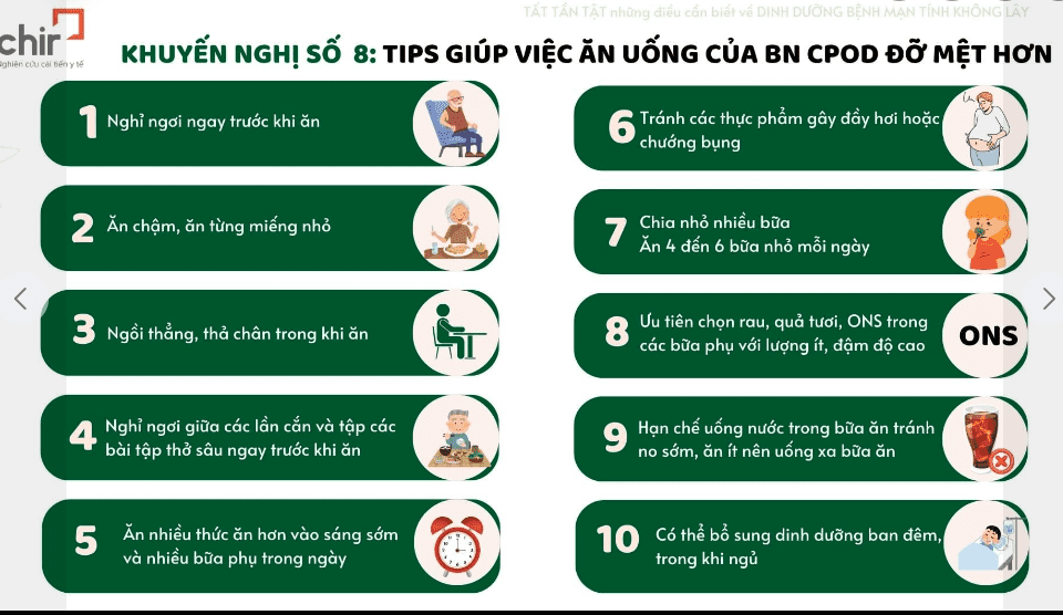 Một chế độ dinh dưỡng hợp lý kết hợp với giữ ấm cơ thể và duy trì tập luyện nhẹ nhàng sẽ giúp người bệnh COPD đối phó tốt hơn trong thời tiết lạnh. Nếu cần tư vấn chi tiết, đừng ngần ngại tìm đến các chuyên gia dinh dưỡng để được hỗ trợ.