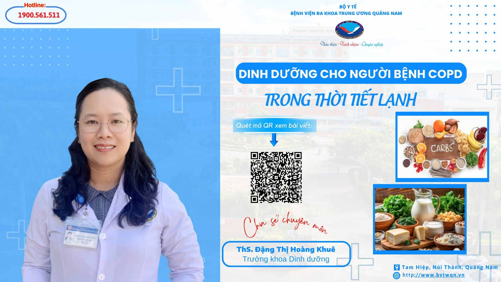 Cùng chúng tôi đến với chia sẻ một số lời khuyên quan trọng về dinh dưỡng cho bệnh nhân mắc bệnh phổi tắc nghẽn mạn tính (COPD) khi thời tiết trở lạnh từ Thạc sĩ Dinh dưỡng Đặng Thị Hoàng Khuê – Trưởng Khoa Dinh dưỡng – Bệnh viện Đa khoa Trung ương Quảng Nam.