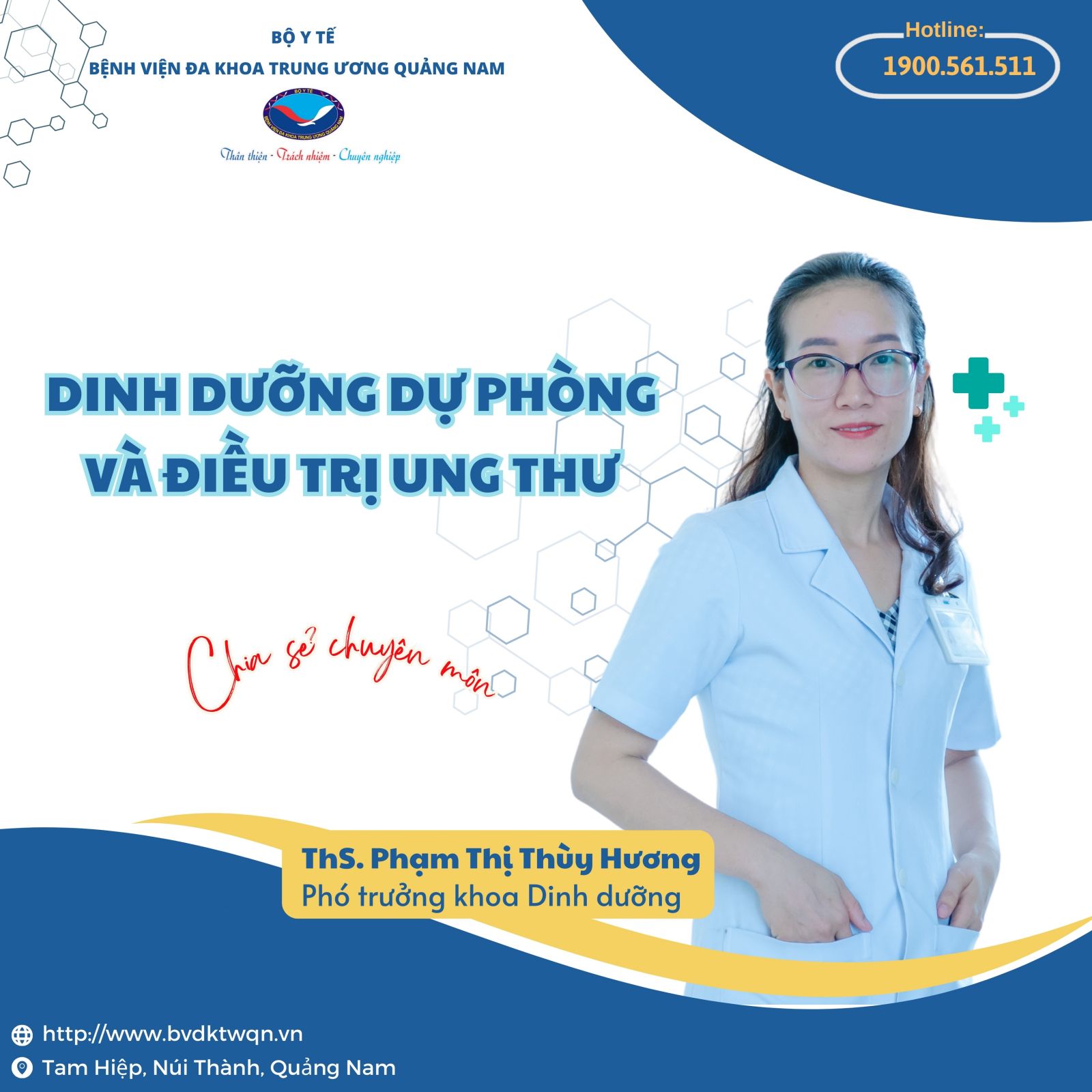 Tất cả những thắc mắc trên sẽ được giải đáp qua lời chia sẻ chuyên môn của Thạc sĩ Phạm Thị Thùy Hương – Phó trưởng khoa Dinh dưỡng, Bệnh viện Đa khoa Trung ương Quảng Nam về chủ đề: “Dinh dưỡng dự phòng và điều trị ung thư”.