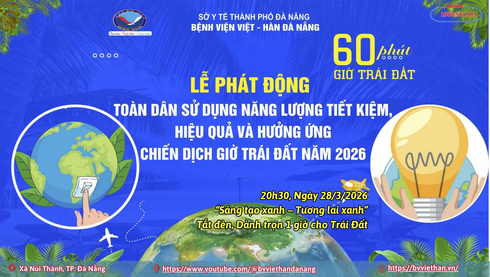 Hưởng ứng Chiến dịch Giờ Trái đất năm 2026 với thông điệp “Sáng tạo xanh – Tương lai xanh”, Bệnh viện Việt – Hàn Đà Nẵng kêu gọi toàn thể cán bộ, viên chức, người lao động và người dân cùng chung tay sử dụng năng lượng tiết kiệm, hiệu quả.