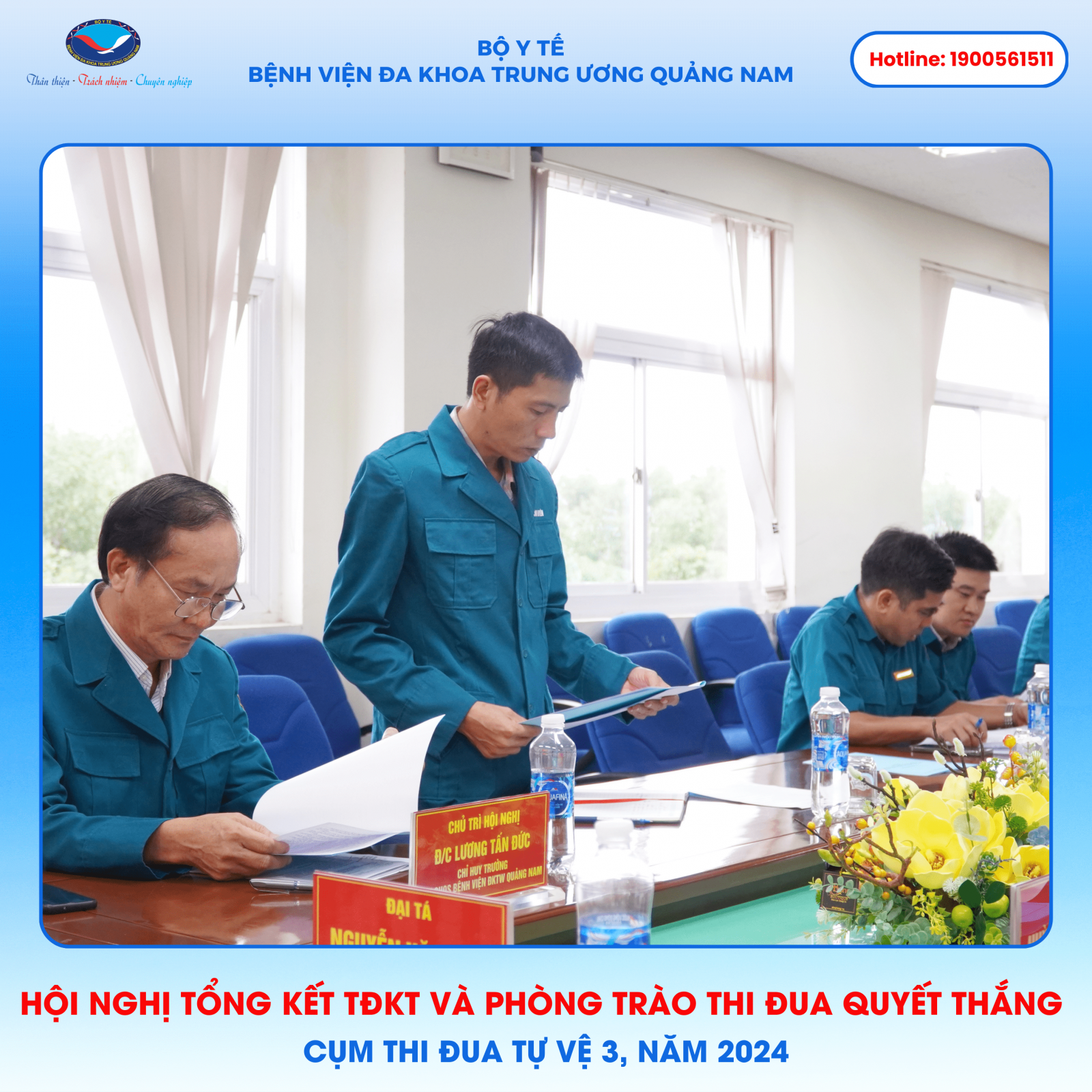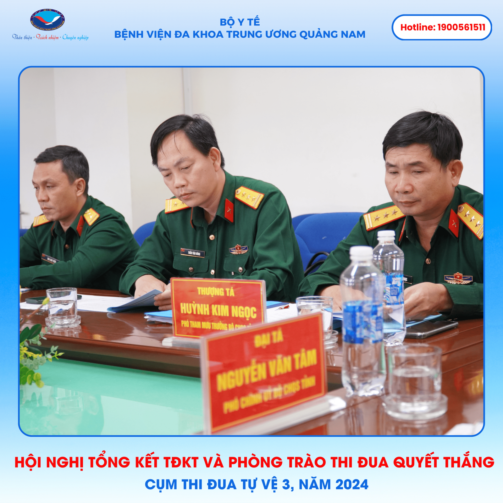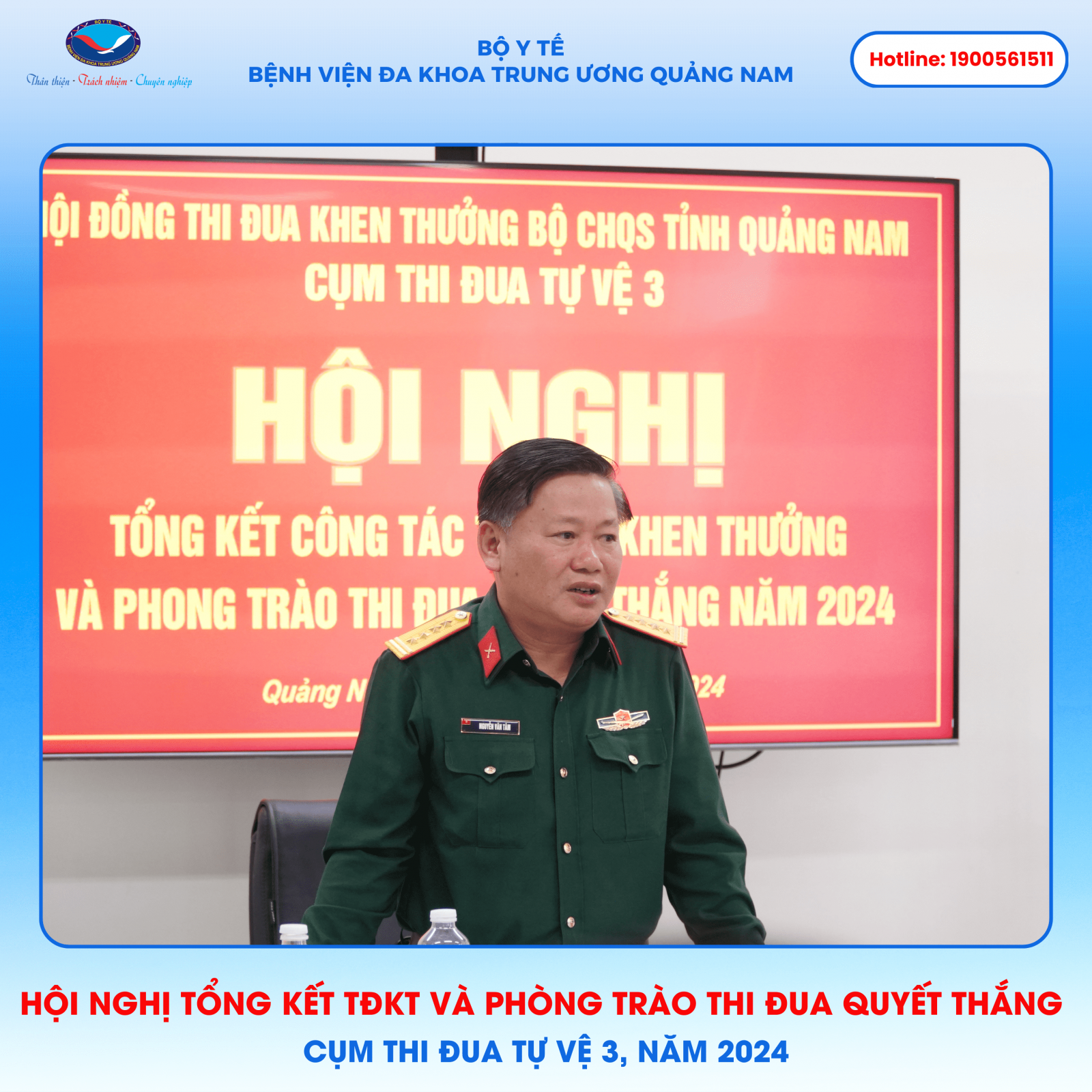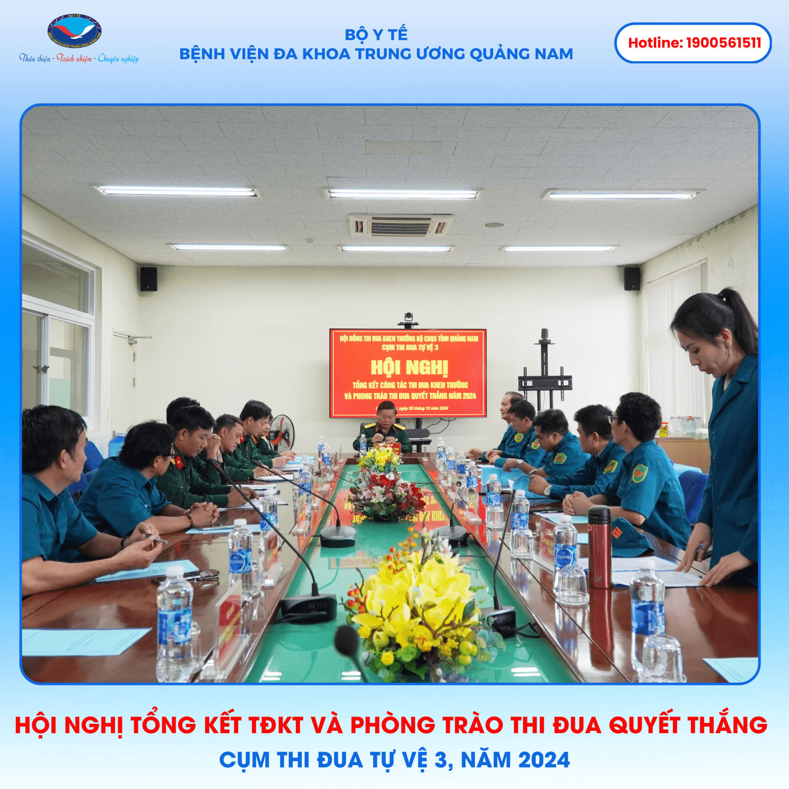 Chiều ngày 05/12/2024, tại Bệnh viện ĐKTW Quảng Nam đã diễn ra “Hội nghị tổng kết thi đua khen thưởng và phong trào thi đua quyết thắng năm 2024” Cụm thi đua tự vệ 3. Bệnh viện ĐKTW Quảng Nam là đơn vị Cụm trưởng chủ trì tổ chức.