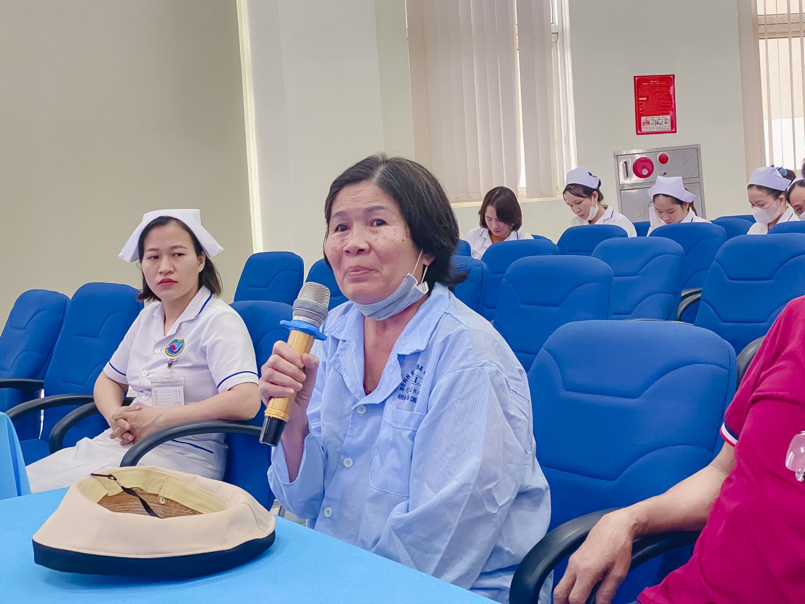 Đại diện Bệnh viện trong cuộc họp, CN. Phan Trần Giang Hoà - Trưởng Phòng Điều Dưỡng ghi nhận những ý kiến đóng góp từ phía người bệnh và gia đình người bệnh để thêm những thông tin về nhu cầu cũng như mong muốn của người bệnh đối với Bệnh viện, những tồn tại mà Bệnh viện cần khắc phục, chấn chỉnh kịp thời để nâng cao chất lượng khám chữa bệnh, chăm sóc và phục vụ người bệnh.