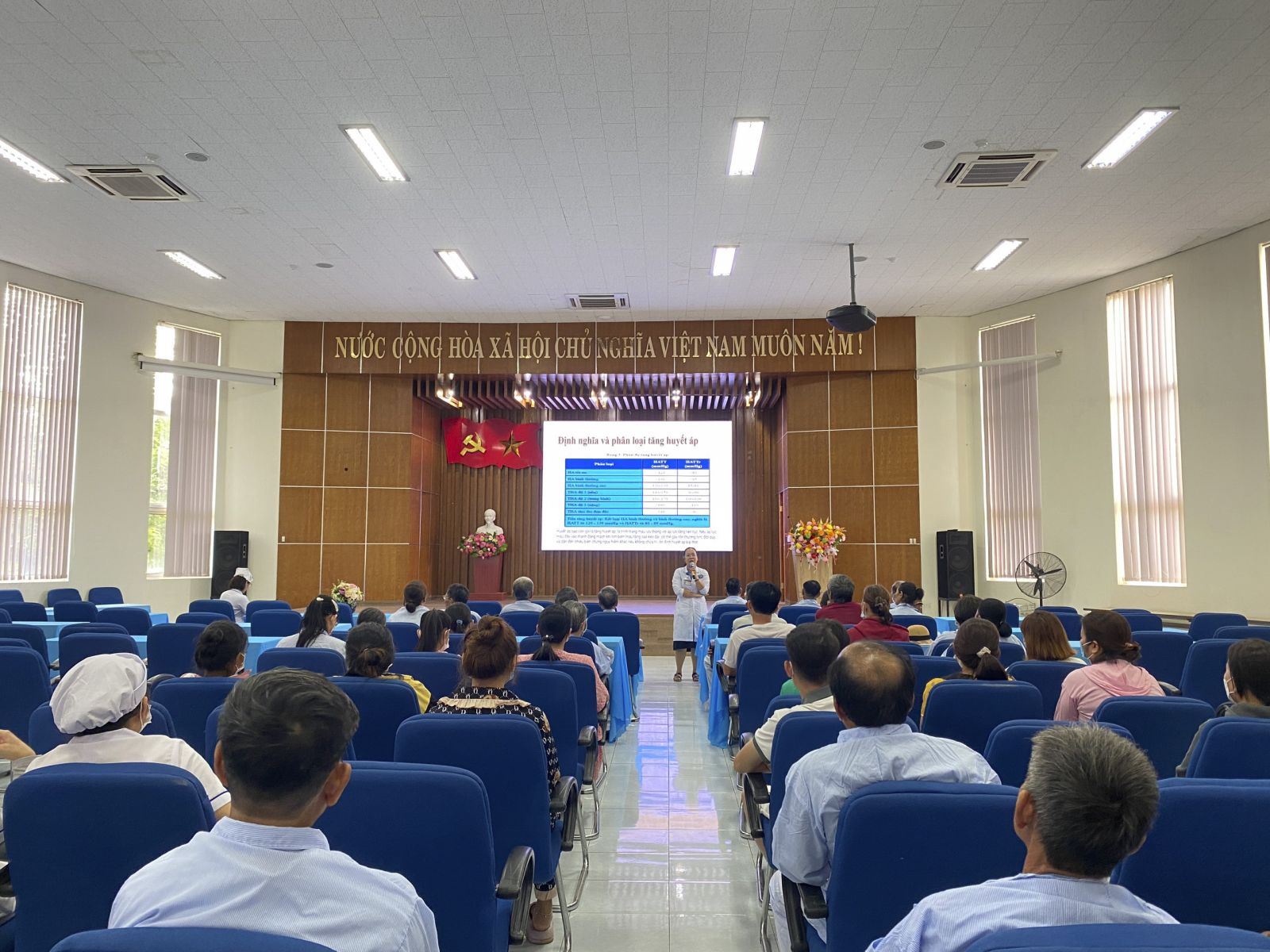 Cũng trong buổi họp, ThS. Đặng Thị Hoàng Khuê - Trưởng Khoa Dinh Dưỡng đã tư vấn cho người bệnh, người nhà người bệnh về Dinh dưỡng cho bệnh lý tăng huyết áp. Thông qua đó, sẽ giúp người bệnh có một lối sống lành mạnh, chế độ dinh dưỡng khoa học, tập thể dục đều đặn hằng ngày để hạn chế các biến chứng của tăng huyết áp.