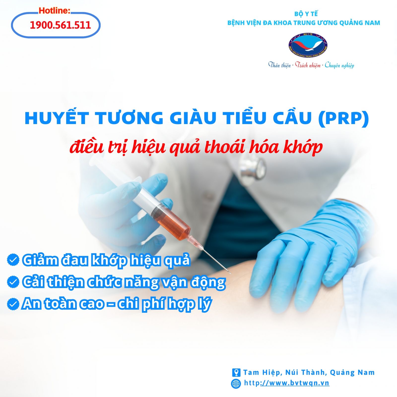 Huyết tương giàu tiểu cầu (PRP) là một phương pháp điều trị tiên tiến mang lại hiệu quả cao trong việc giảm đau, tái tạo mô và cải thiện chức năng vận động cho bệnh nhân bị thoái hóa khớp. Với những lợi ích vượt trội, PRP đang ngày càng được ứng dụng rộng rãi trong y học. Nếu bạn đang tìm kiếm một phương pháp điều trị an toàn, hiệu quả và ít xâm lấn, hãy cân nhắc lựa chọn PRP tại Bệnh viện Đa khoa Trung ương Quảng Nam để có được sự chăm sóc tốt nhất từ các bác sĩ đầu ngành về chấn thương chỉnh hình.