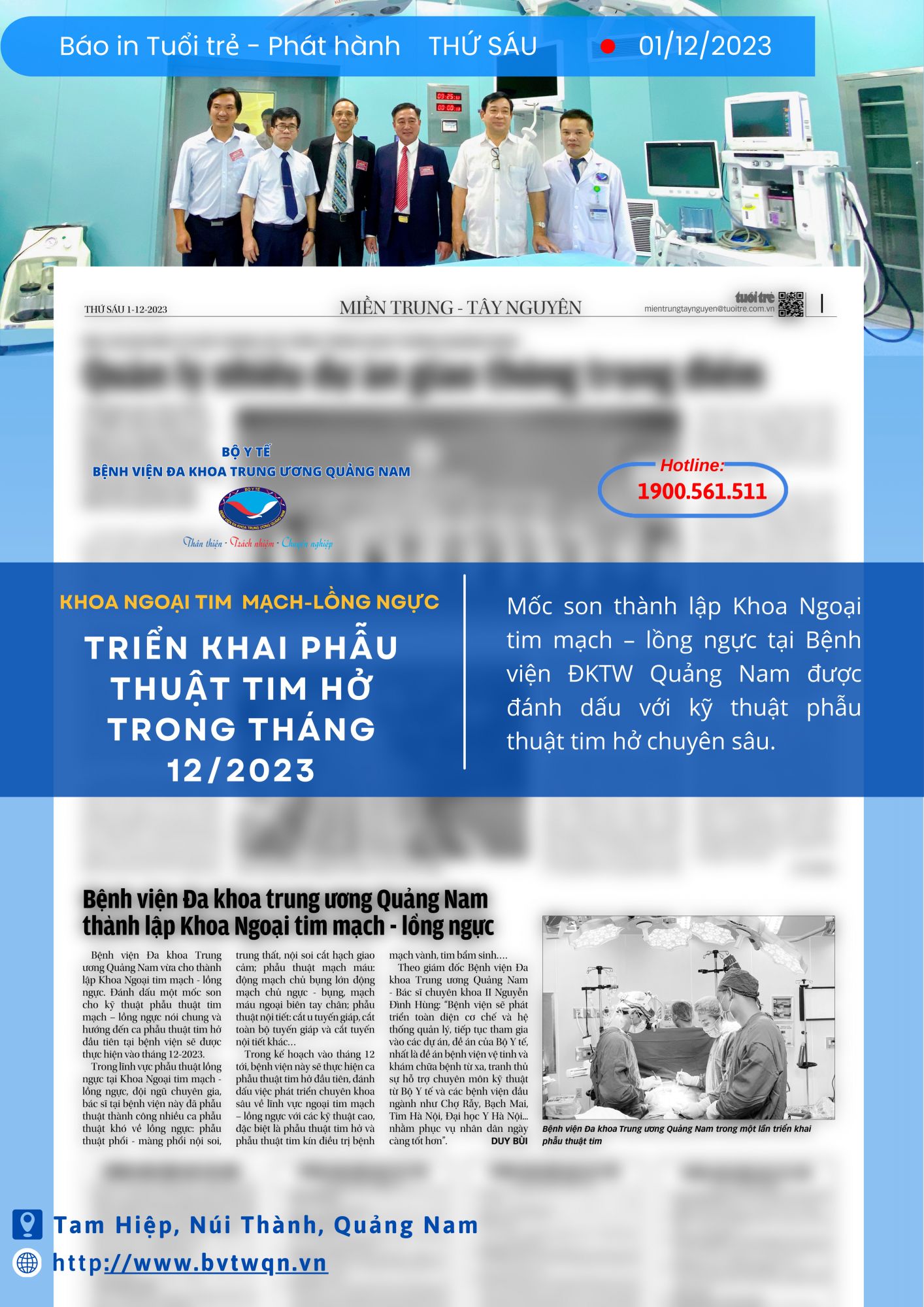 Kính mời các bạn đọc tin tức về thành lập Khoa Ngoại tim mạch-lồng ngực, Bệnh viện ĐKTW Quảng Nam và mốc son trở thành nơi đầu tiên của địa bàn Quảng Nam, Quảng Ngãi, Bình Định... phẫu thuật tim hở thường quy đầu tiên trong tháng 12/2023 này.