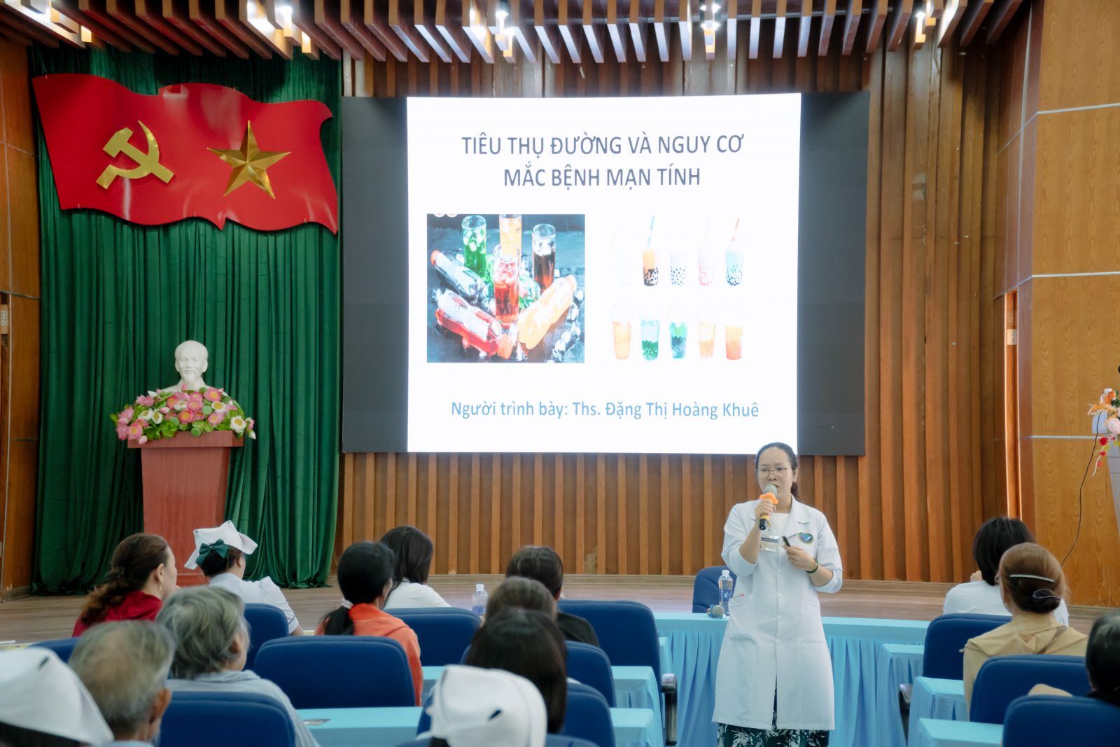 Bên cạnh nội dung chính, buổi gặp mặt còn mang đến phần chia sẻ thiết thực về chủ đề “Tiêu thụ đường và nguy cơ mắc bệnh mạn tính” do ThS. Đặng Thị Hoàng Khuê – Trưởng khoa Dinh dưỡng – trình bày. Bài chia sẻ giúp người bệnh hiểu rõ hơn tác động của đường đến sức khỏe, đặc biệt trong bối cảnh các bệnh mạn tính như tiểu đường, tim mạch đang ngày càng gia tăng.