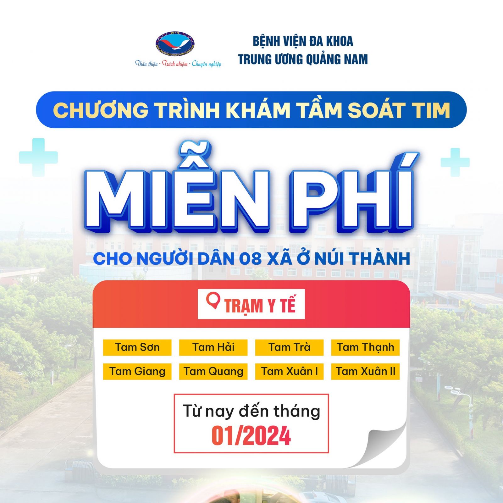 Hiện nay, Bệnh viện Đa khoa Trung ương Quảng Nam đang kết hợp với Trung tâm Y tế huyện Núi Thành tổ chức chương trình khám sàng lọc tim MIỄN PHÍ tại 08 trạm y tế trên địa bàn huyện Núi Thành, cụ thể:
