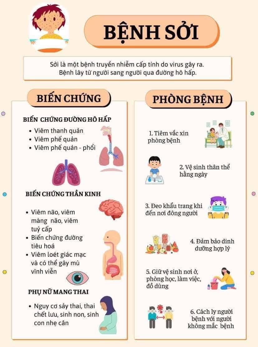 Bệnh sởi là một trong những bệnh truyền nhiễm phổ biến và có mức độ lây lan cao, đặc biệt ở trẻ nhỏ và những người chưa được tiêm phòng vắc-xin. Dù có thể bắt đầu với những triệu chứng giống cảm lạnh hoặc cúm, sởi có thể dẫn đến các biến chứng nghiêm trọng như viêm phổi, viêm não, suy giảm miễn dịch kéo dài, thậm chí tử vong nếu không được điều trị kịp thời.