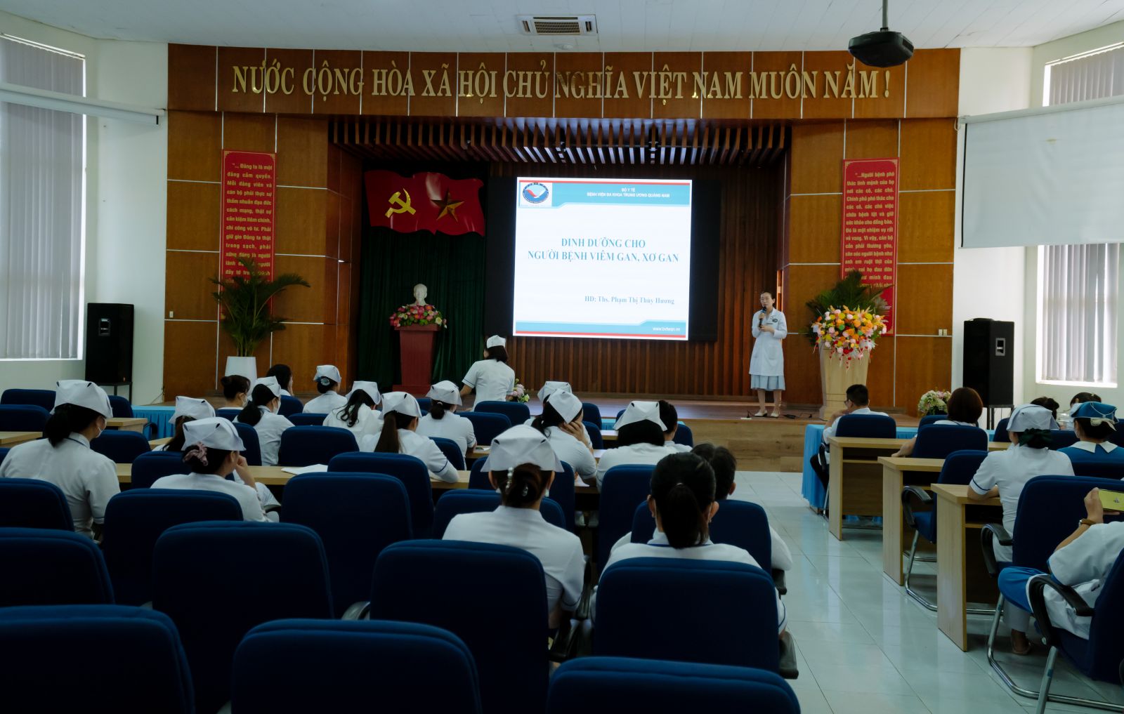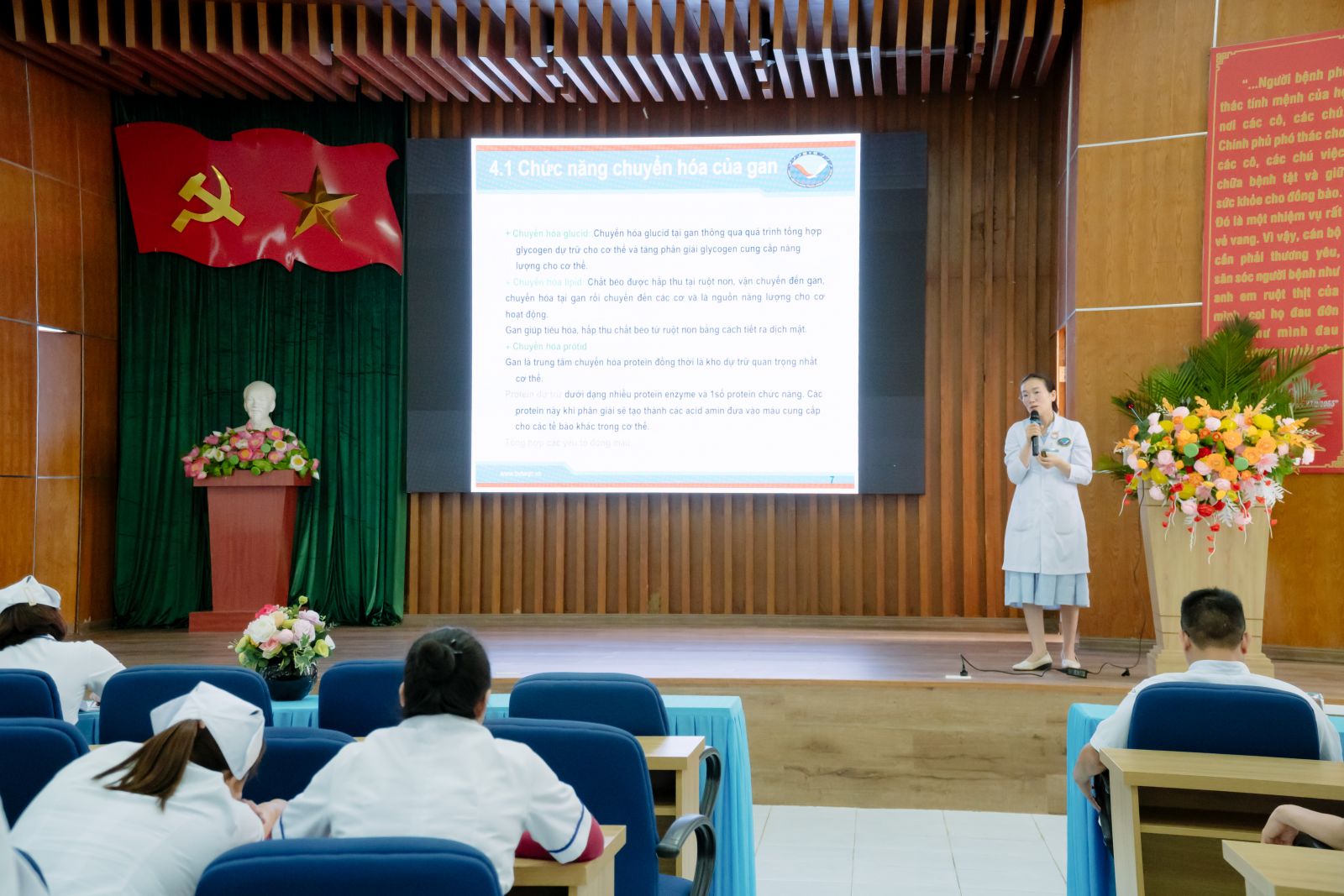 Phòng Điều dưỡng chủ trì buổi sinh hoạt và với phần trình bày chuyên môn của ThS. Phạm Thị Thùy Hương – Phó Trưởng khoa Dinh dưỡng. Nội dung bài giảng tập trung vào vai trò thiết yếu của chế độ dinh dưỡng trong quản lý và điều trị bệnh lý gan, cách xây dựng thực đơn phù hợp với từng giai đoạn bệnh, đồng thời cung cấp các tình huống thực tế giúp học viên dễ áp dụng trong công tác chăm sóc người bệnh.