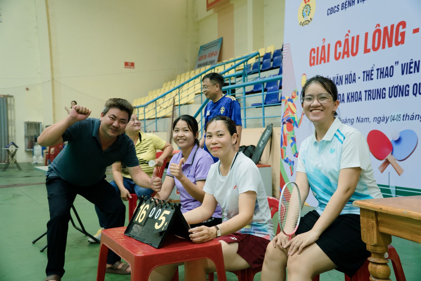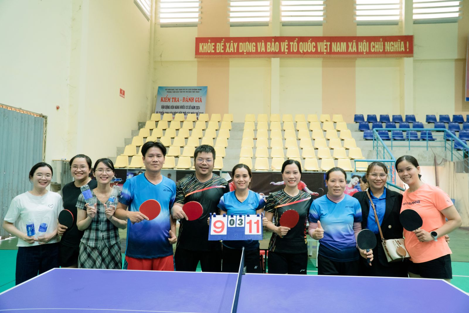 Các cổ động viên cùng vận động viên thể hiện tinh thần đoàn kết, phấn khởi sau trận bóng bàn.