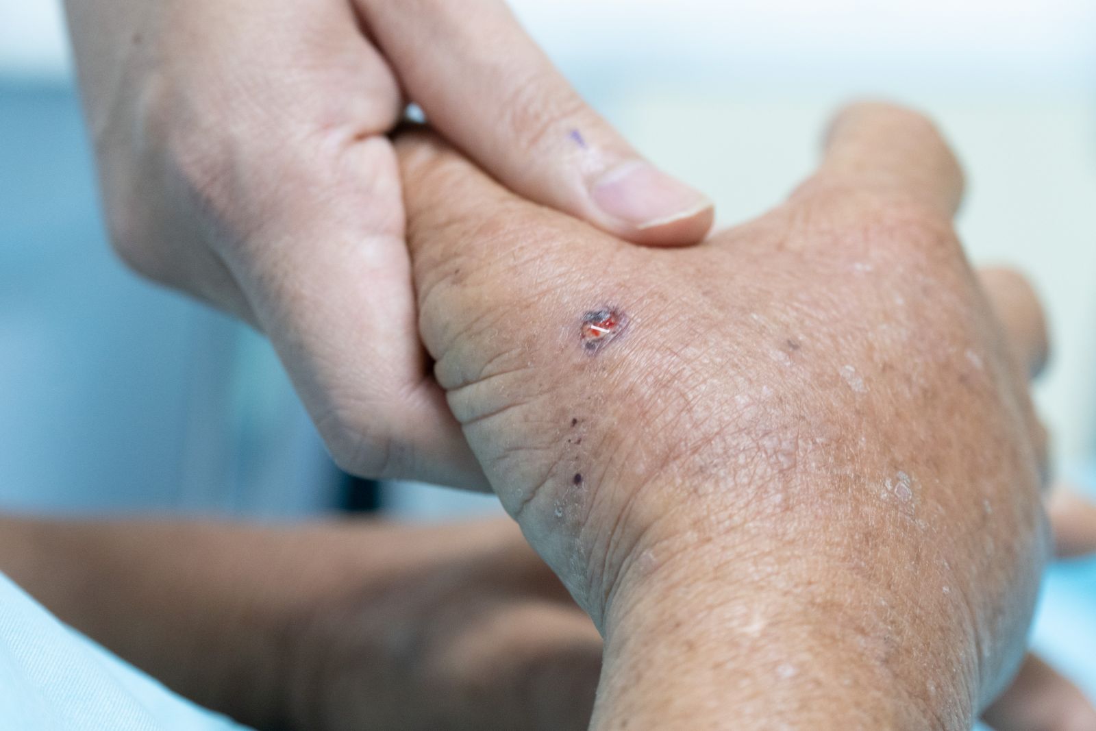Một trong những vết thương do ong vò vẽ đốt trên tay ông D. Ảnh: Tổ CTXH