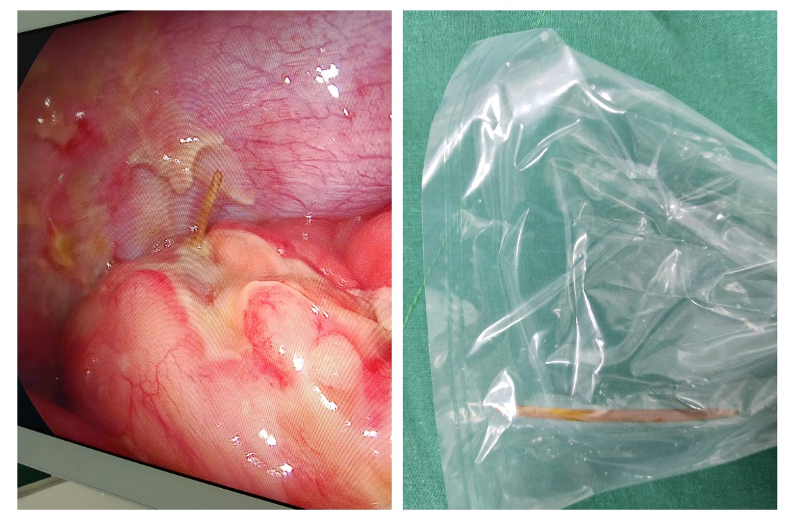 Di vật tăm trong ruột non người bệnh và sau khi được lấy ra.