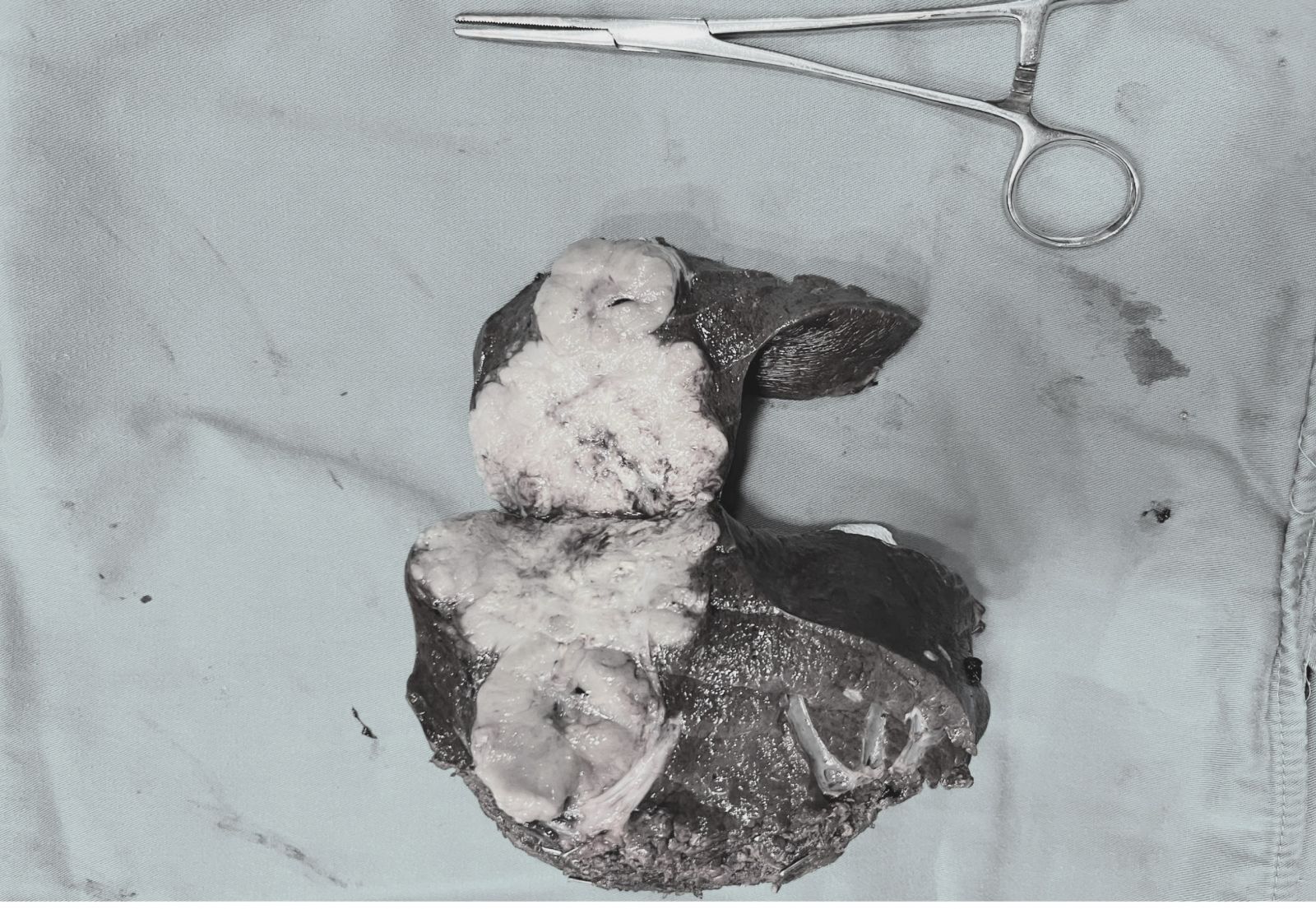 Khối u gan khoảng 400 gram được lấy ra sau phẫu thuật.