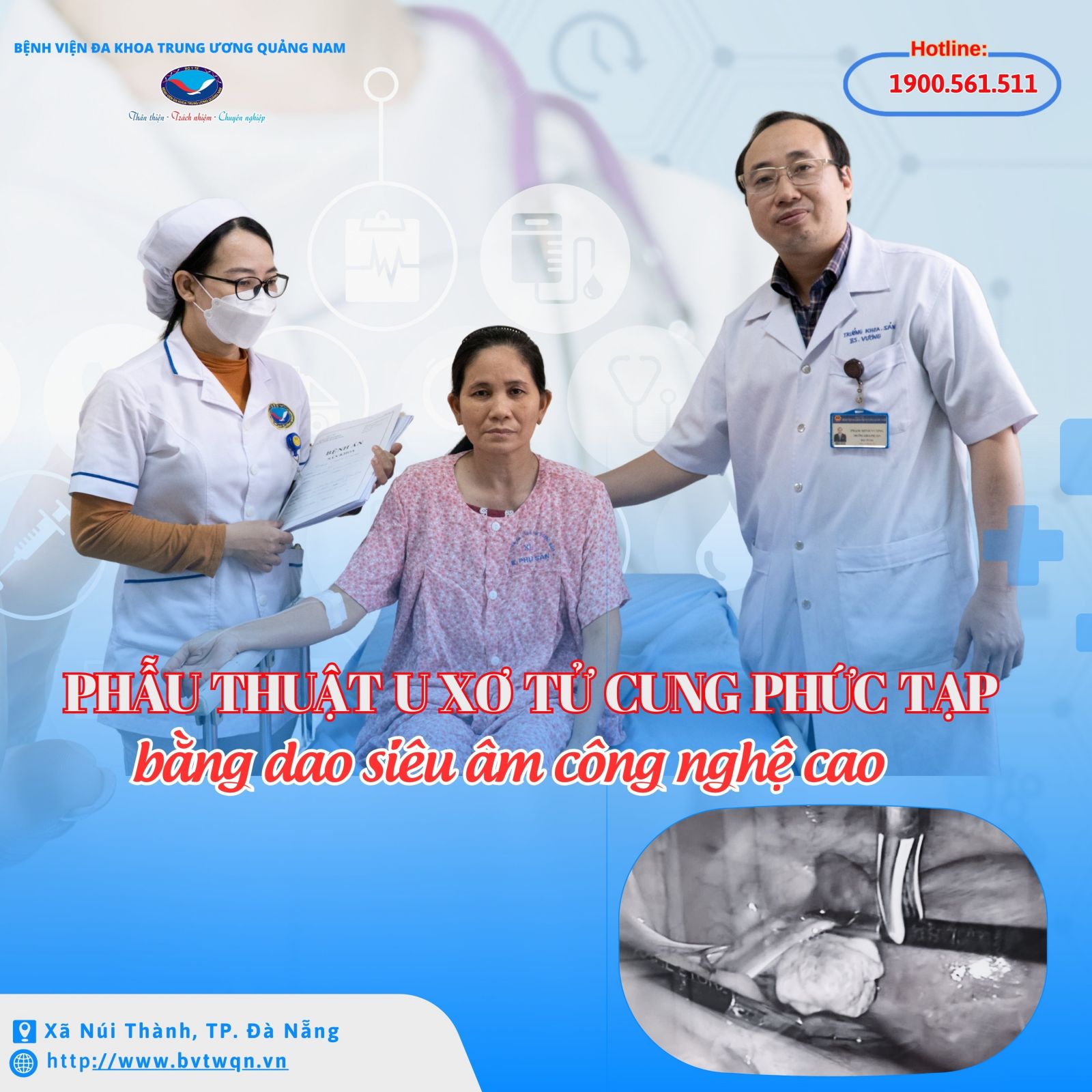 Vừa qua, Bệnh viện Đa khoa Trung ương Quảng Nam đã phẫu thuật thành công một ca u xơ tử cung phức tạp bằng phương pháp nội soi ổ bụng ứng dụng dao siêu âm công nghệ cao, giúp người bệnh nữ 50 tuổi hồi phục nhanh, an toàn và hạn chế tối đa biến chứng.