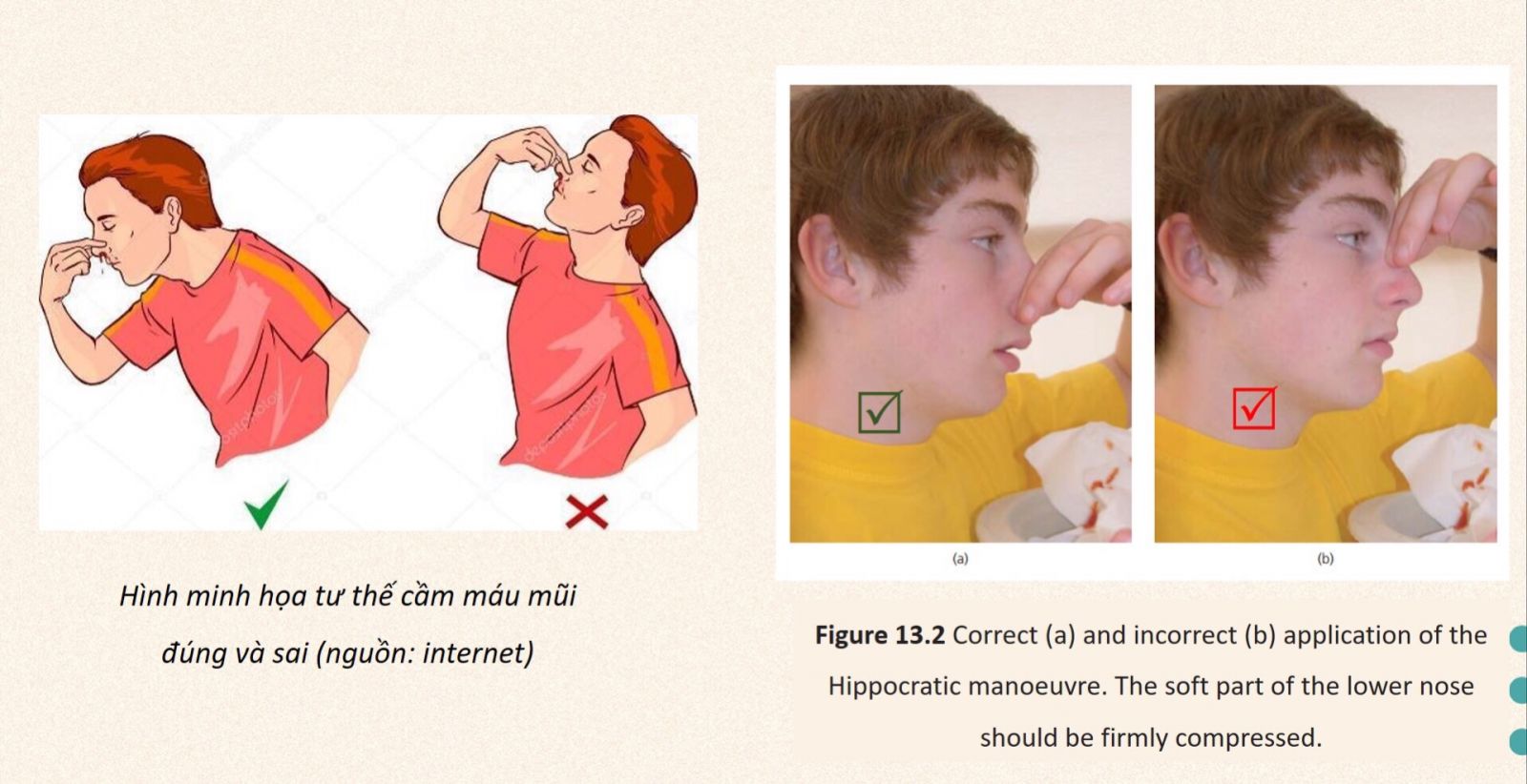 - Dùng hai ngón tay bóp chặt cánh mũi và thở bằng miệng để ngăn máu chảy ra, máu chảy xuống họng thì nhả ra, không nuốt vì sẽ gây nôn ói.