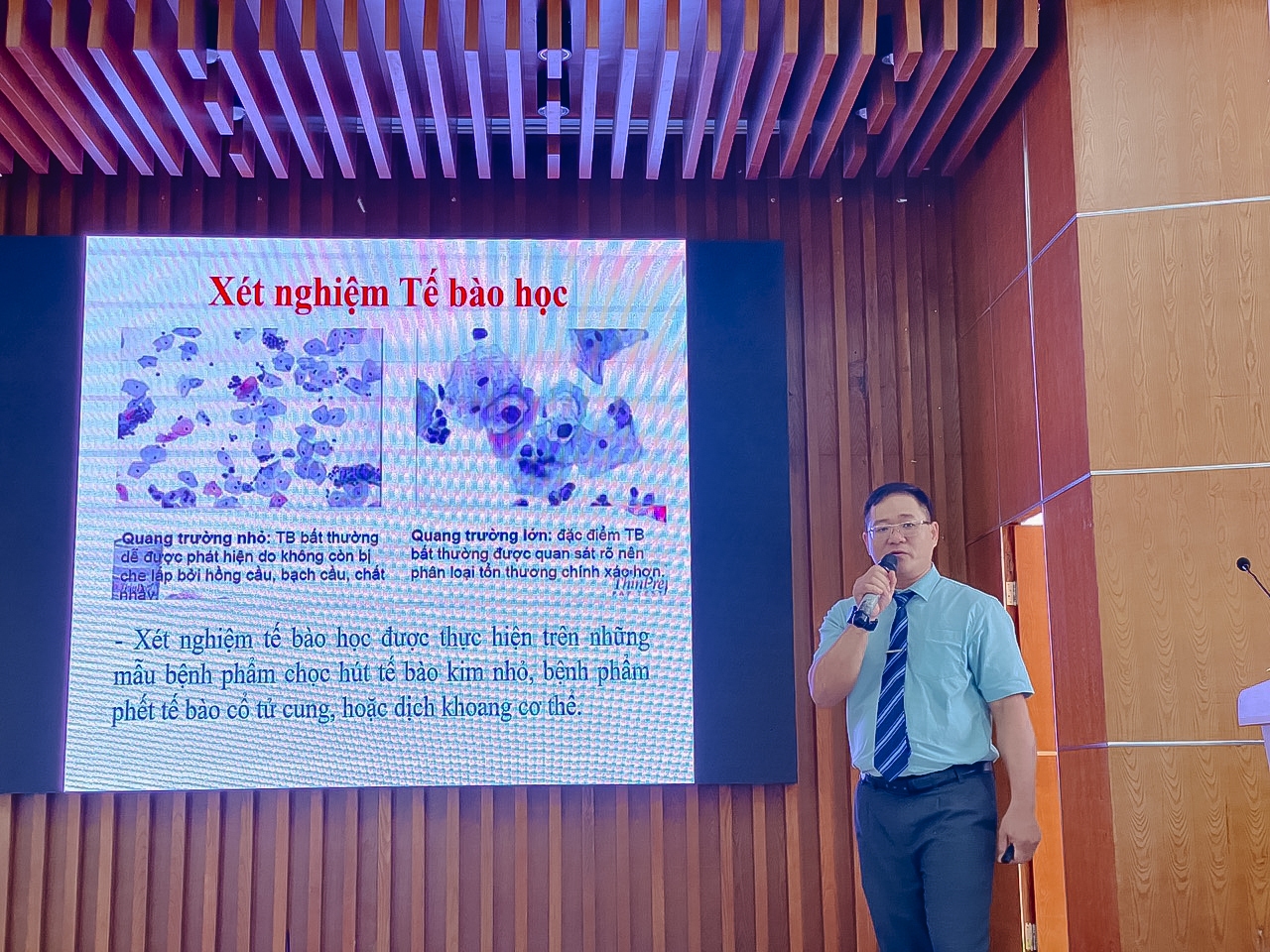 Trong phần báo cáo của TS.BS Phạm Nguyên Cường đã trình bày về các nội dung chính như: xét nghiệm giải phẫu bệnh, tế bào học, sinh thiết mô bệnh học; tiêu bản mẫu mô nội soi bấm sinh thiết, sinh thiết mổ hở, nhuộm H.E x 400 lần...; cấu tạo tế bào; mức độ tế bào và mức độ gen; đột biến gen...