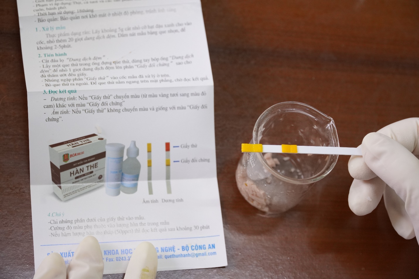 - Kit kiểm tra nhanh hàn the: người sử dụng thực phẩm có hàn the lâu dài sẽ gây ung thư, do hàn the không đào thải hết ra ngoài cơ thể mà tích lũy trong cơ thể, độc tố của hàn the còn làm thoái hóa cơ quan sinh dục. Hầu hết các quốc gia trên thế giới kể cả Việt Nam đã không cho phép sử dụng hàn the trong chế biến thực phẩm. Tuy nhiên nhiều cơ sở sản xuất coi thường sức khỏe người tiêu dùng vẫn tiếp tục sử dụng hàn the trong chế biến giò, chả, bánh đúc, bánh cuốn…
