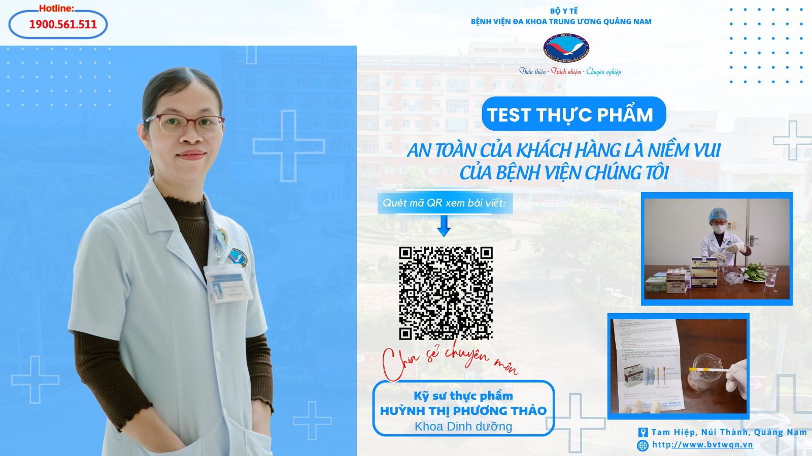 Hiện nay, Khoa Dinh dưỡng, Bệnh viện Đa khoa Trung ương Quảng Nam đã triển khai kỹ thuật về test nhanh thực phẩm của các mặt hàng tươi sống hàng ngày nhập vào để mọi thực phẩm an toàn nhất sẽ đến với khách hàng khi sử dụng dịch vụ ăn uống tại Bệnh viện.