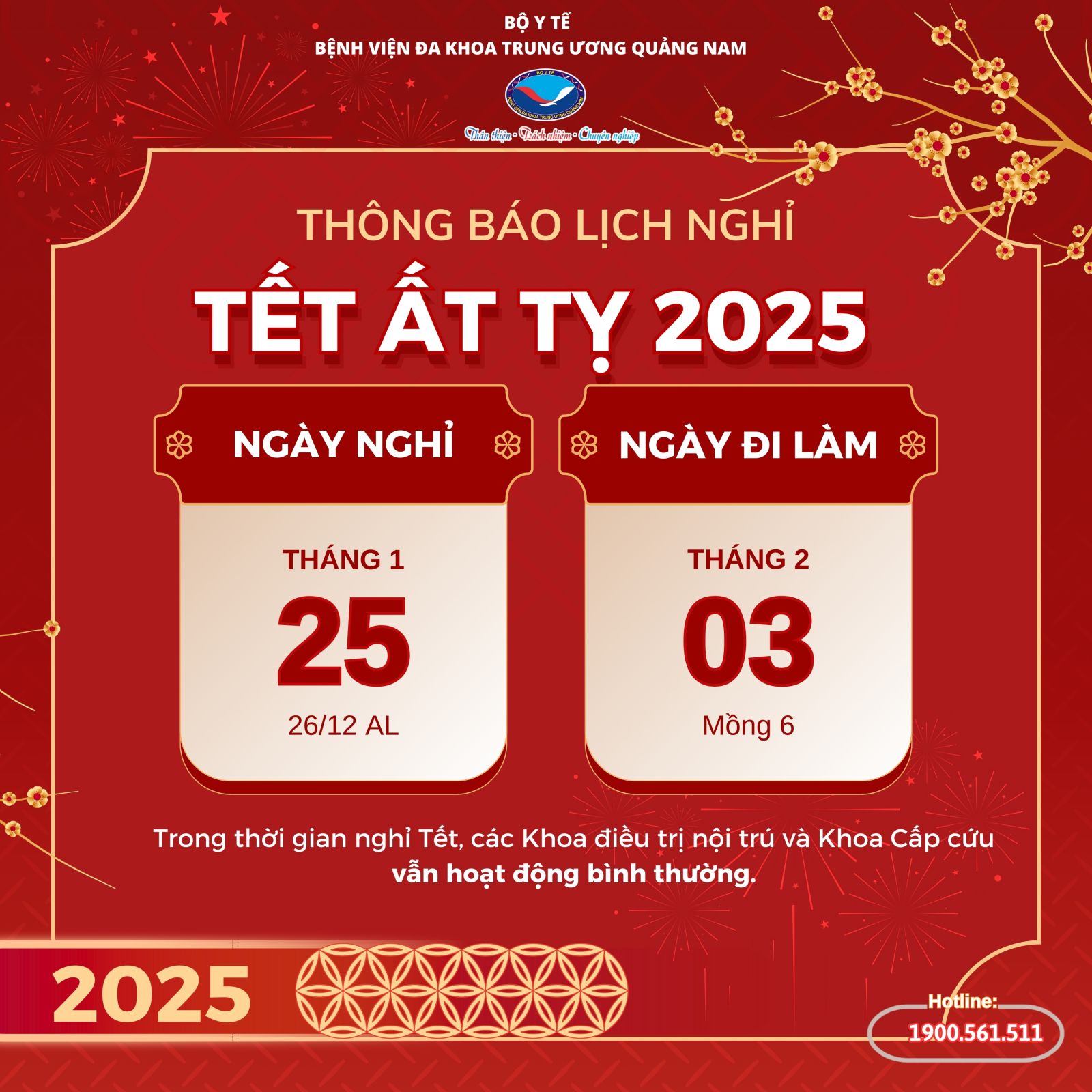 Bệnh viện sẽ nghỉ Tết Nguyên Đán từ ngày 25/01/2025 (26 âm lịch) đến hết ngày 02/02/2025 ( mùng 05 âm lịch).