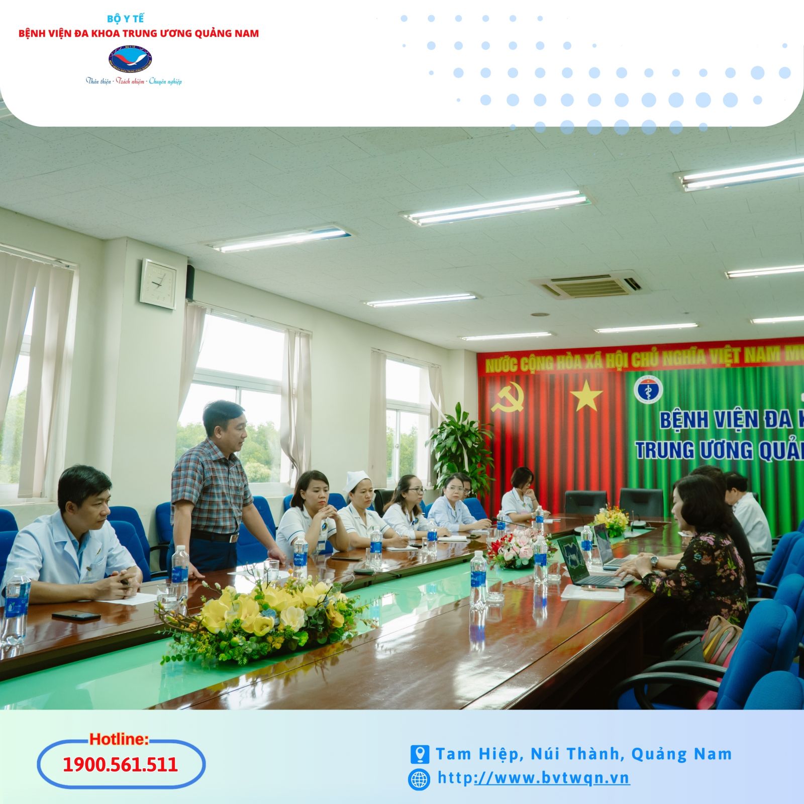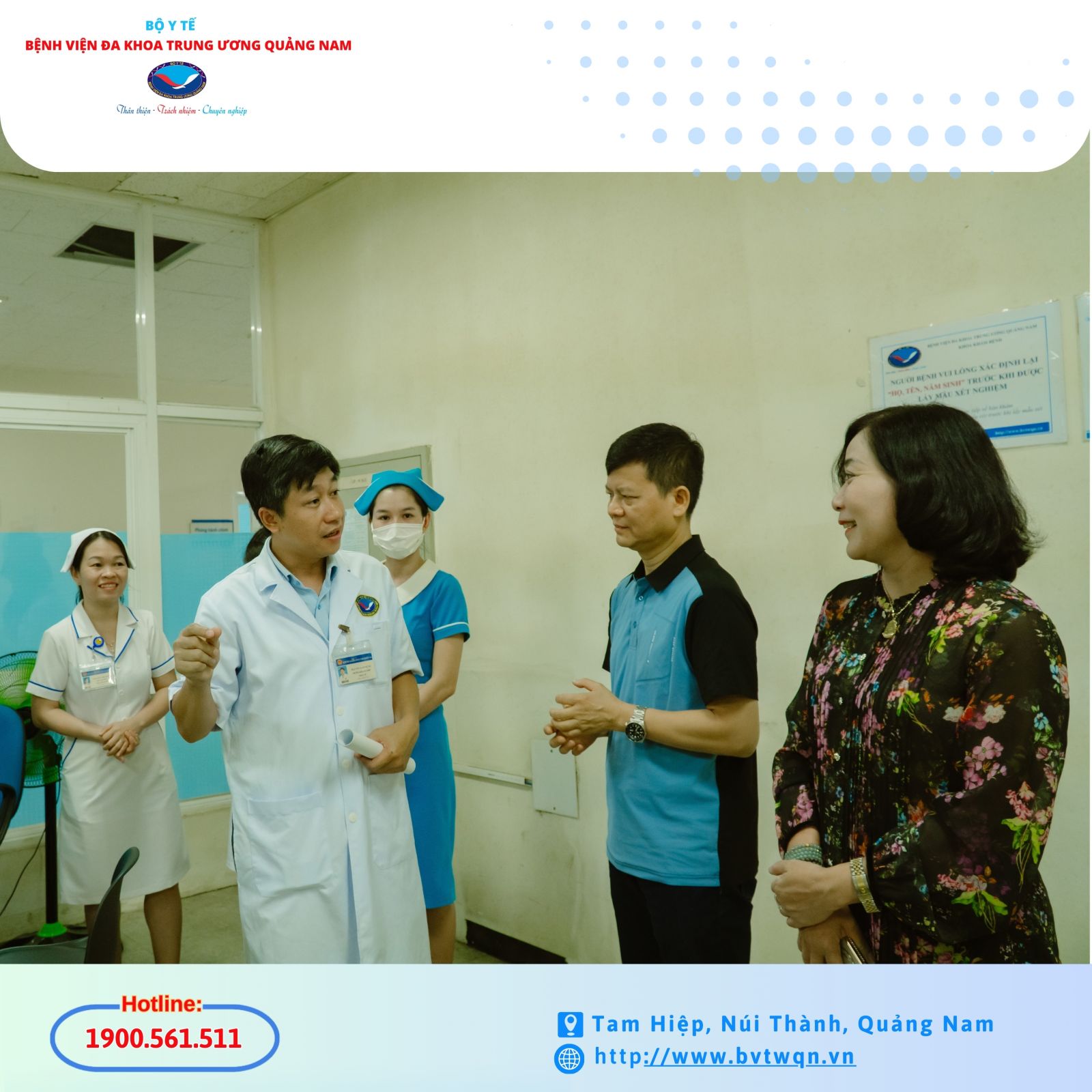 Đón đoàn về phía Bệnh viện Đa khoa Trung ương Quảng Nam có BSCKII. Nguyễn Đình Hùng – Giám đốc Bệnh viện, ThS. Nguyễn Anh Dũng – Trưởng khoa Hóa sinh cùng các đồng chí thuộc các khoa, phòng liên quan trong toàn viện.