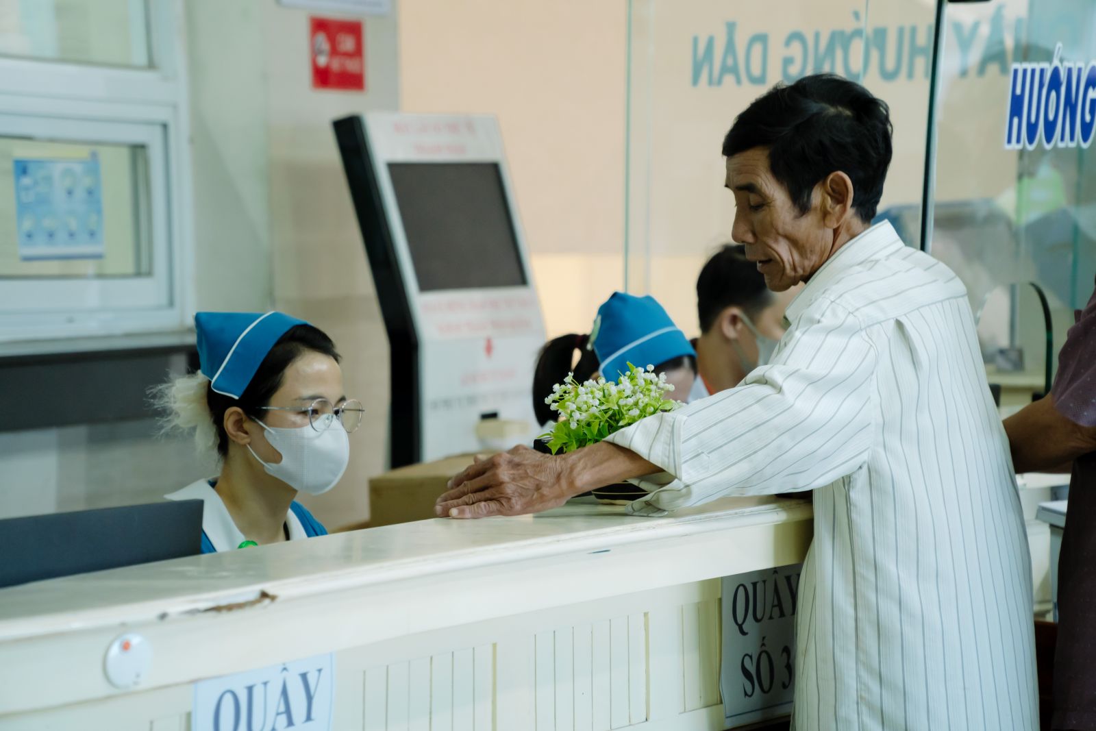 Hướng dẫn người bệnh tại quầy Tiếp đón Khoa Khám Bệnh, Bệnh viện Đa khoa Trung ương Quảng Nam.