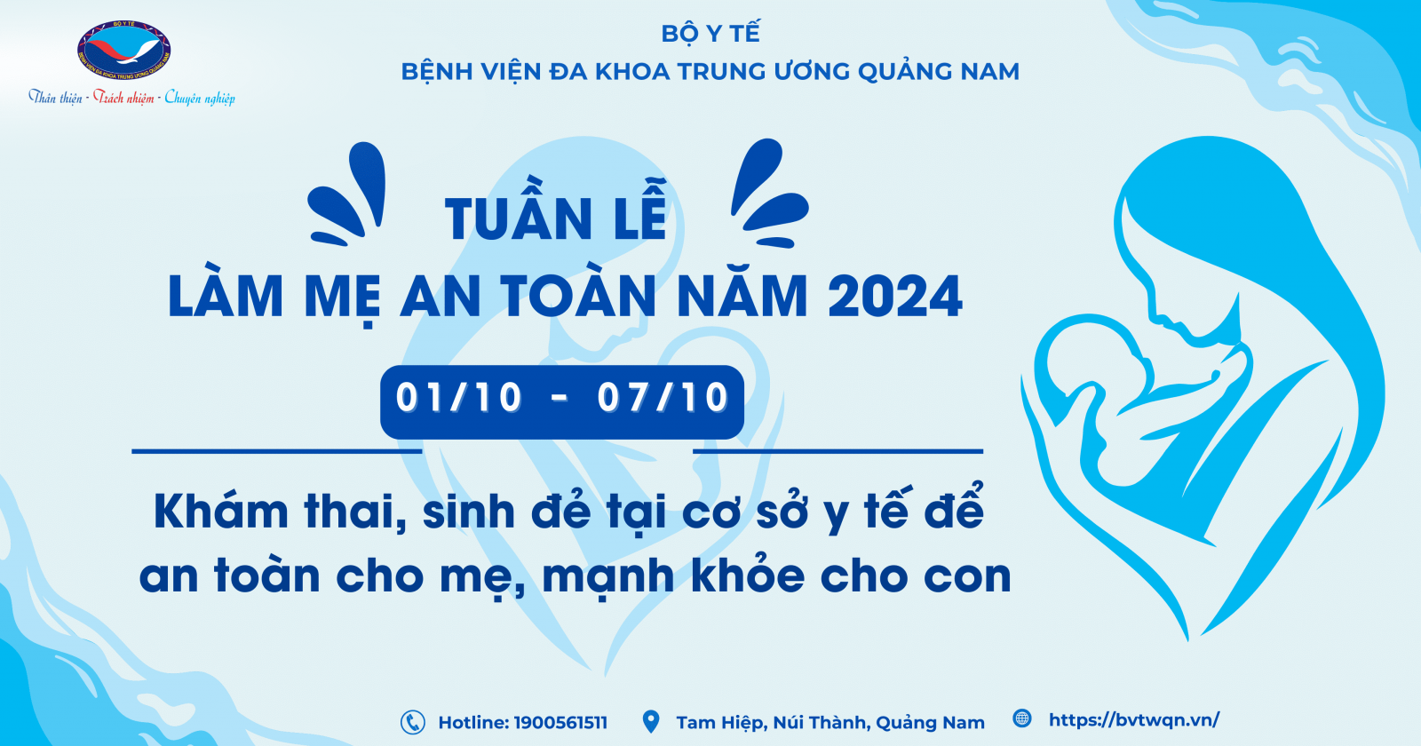 Tại Bệnh viện Đa khoa Trung ương Quảng Nam, nhằm hưởng ứng “Tuần lễ Làm mẹ an toàn năm 2024” Bệnh viện đã triển khai nhiều hoạt động tuyên truyền thông qua các hình thức trực tiếp và gián tiếp như: